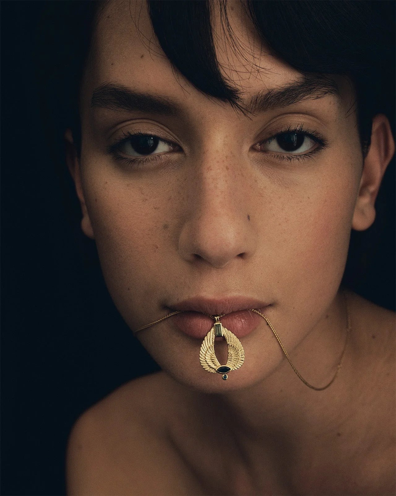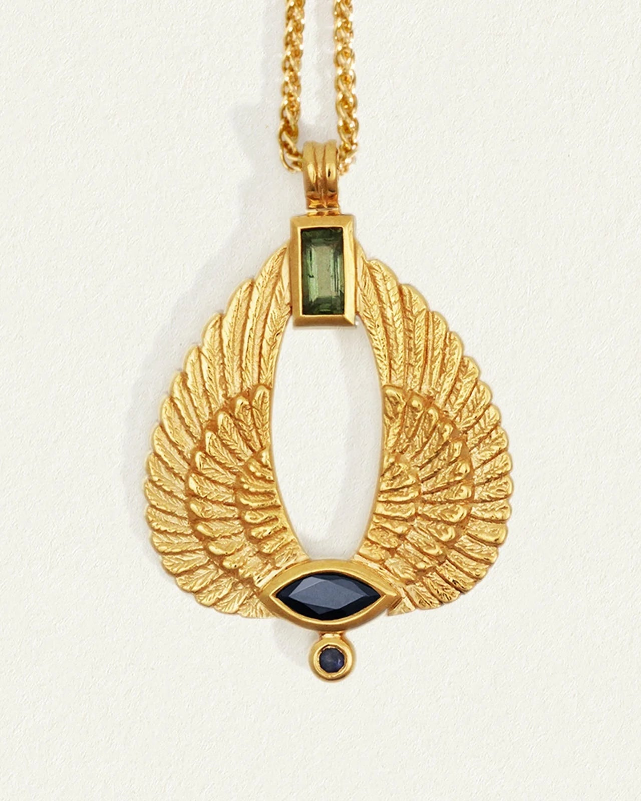 The wings signify spirituality, holiness, and lightness to the world; with a baguette cut Green Apatite regarded for harnessing personal power and Dark Blue Sapphires for wisdom. The Aum necklace is an elegant talisman of warmth and protection.