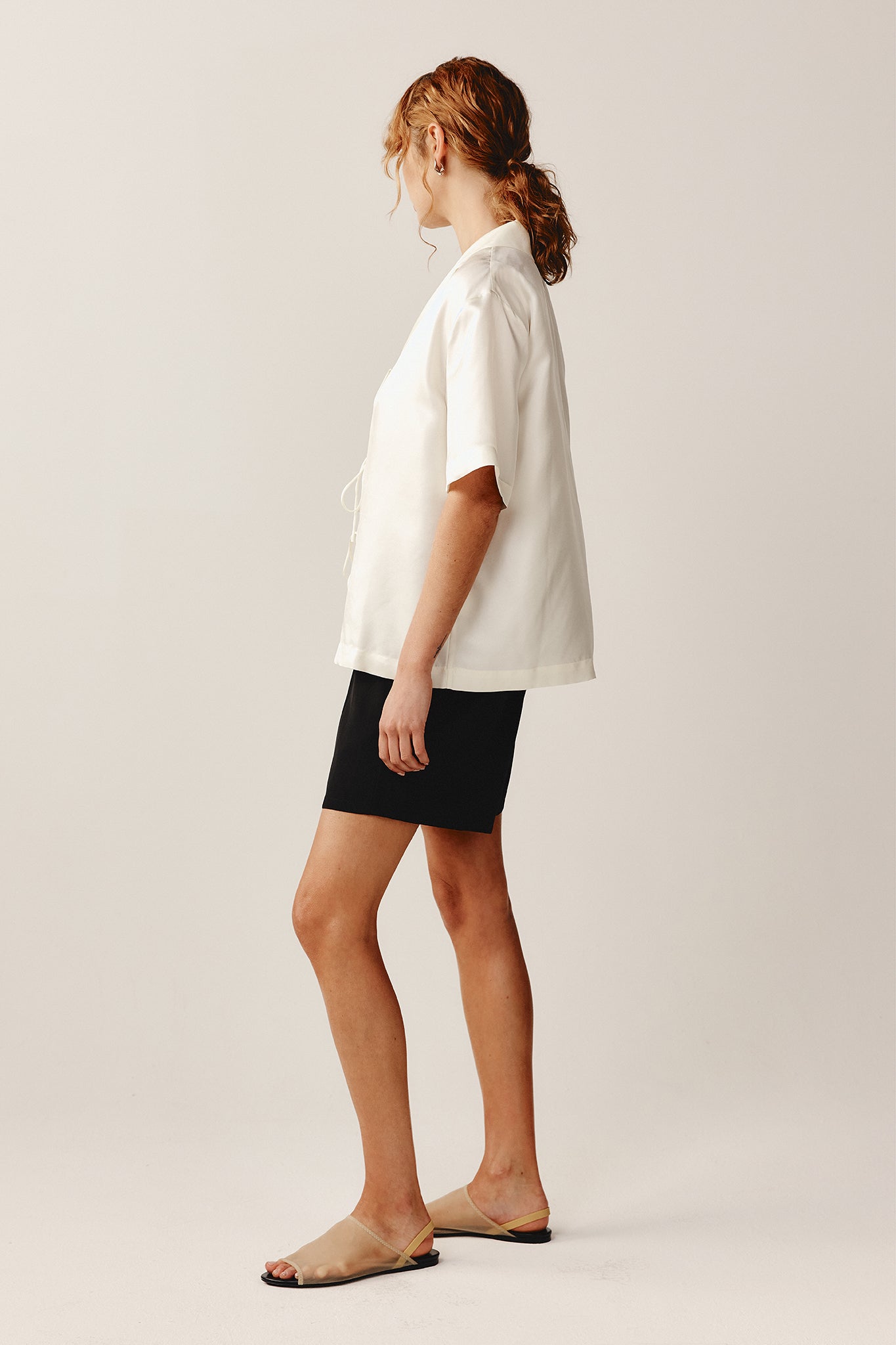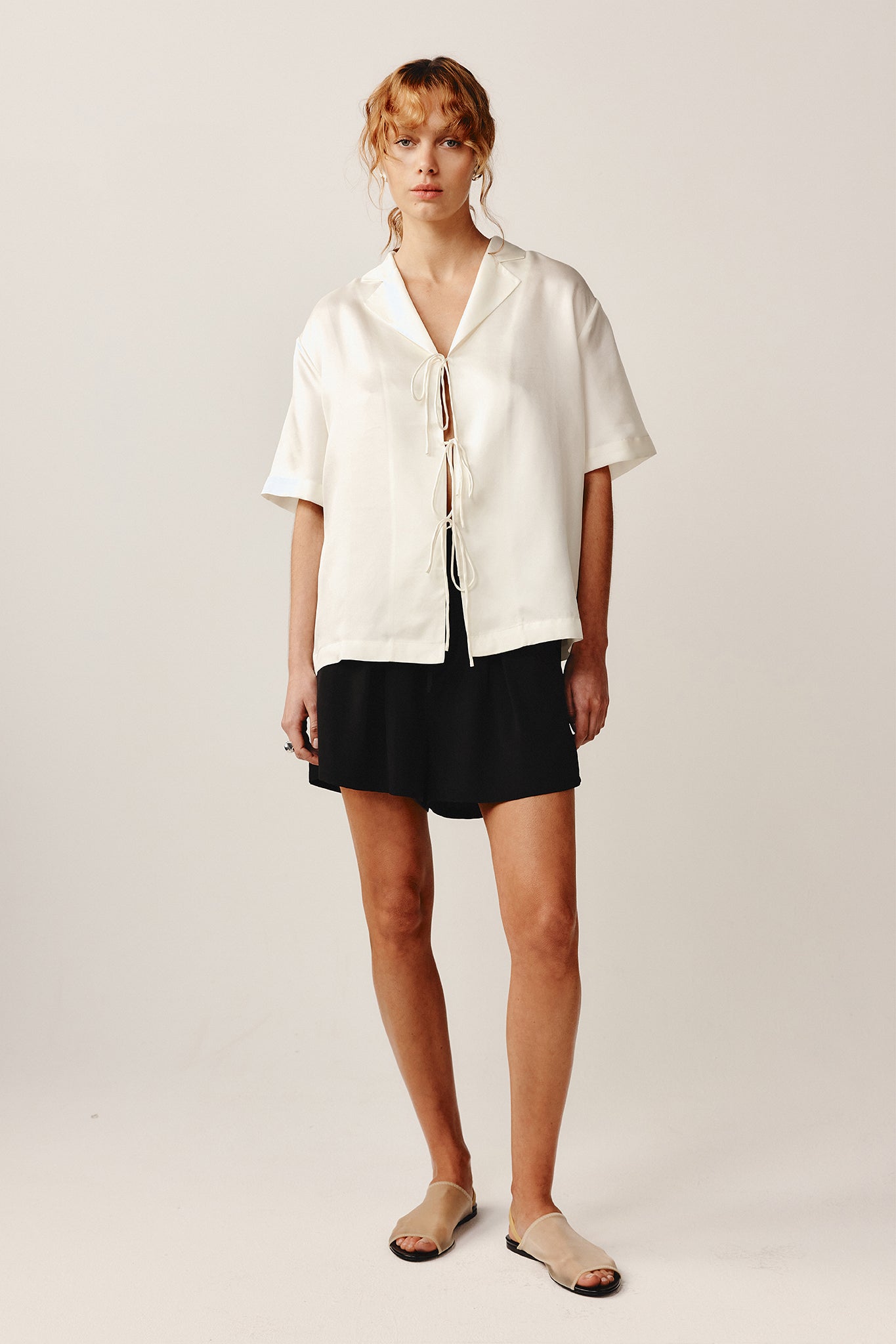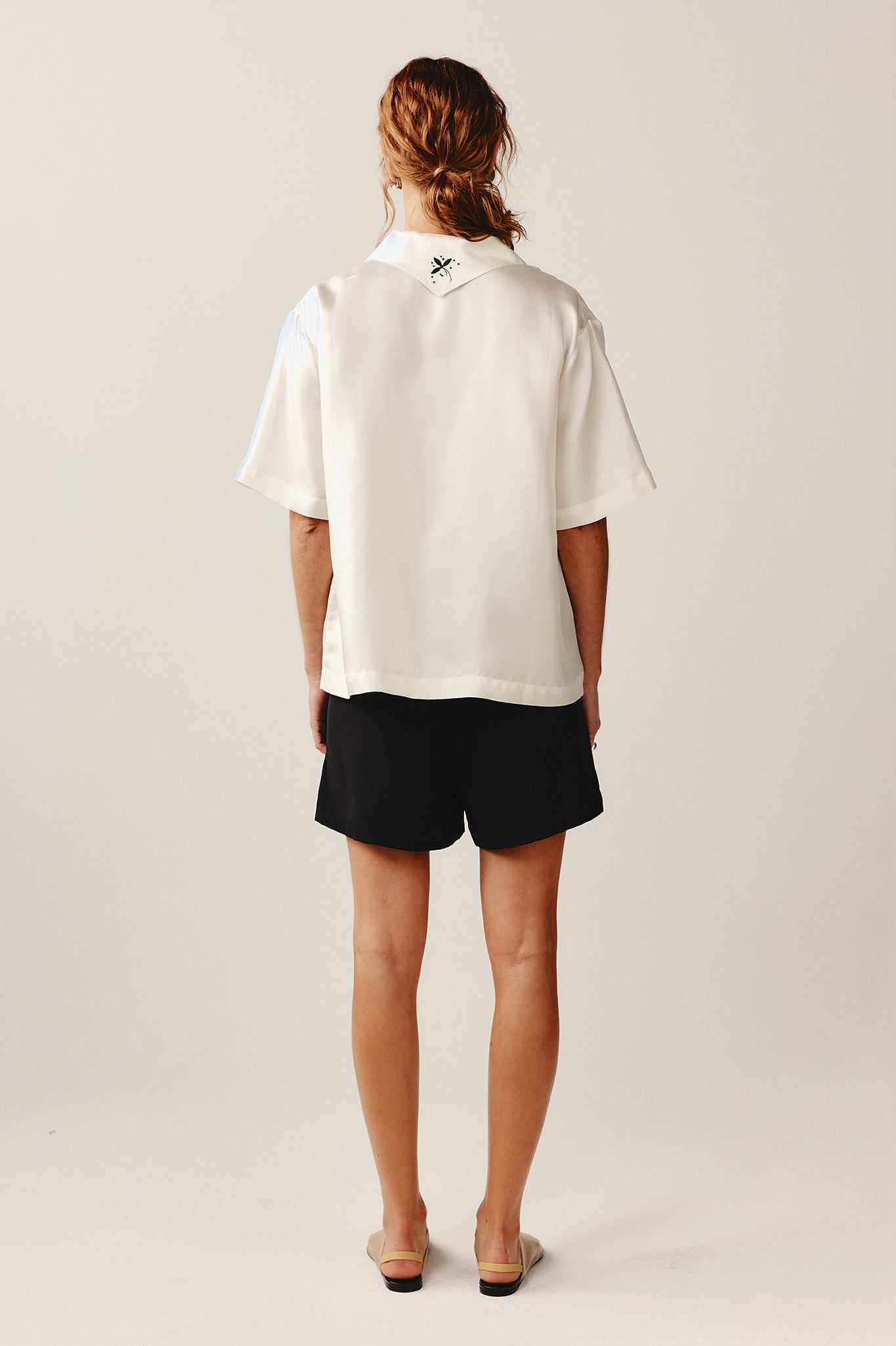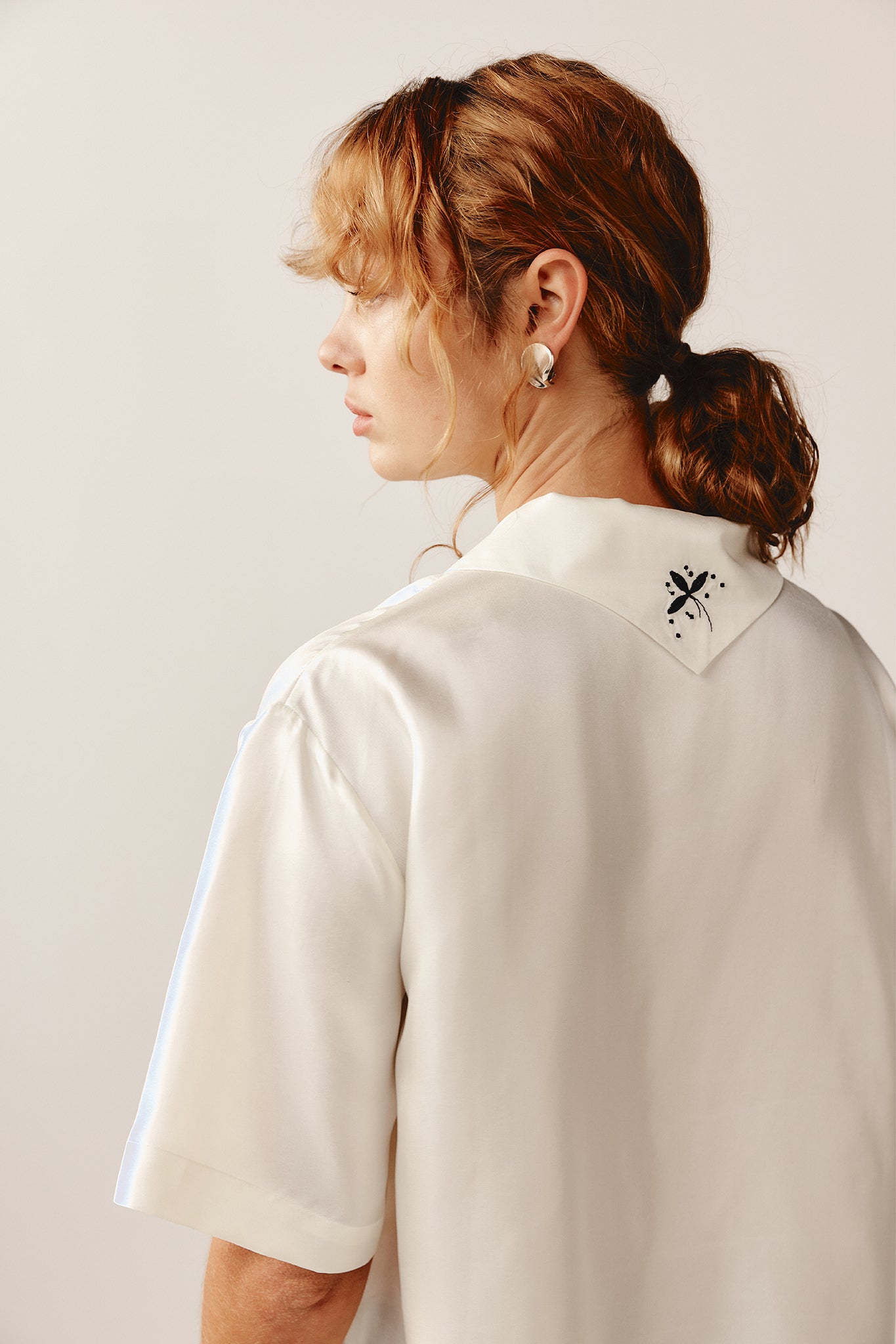 Introducing Marle's Billea Shirt in Ivory. The Billea shirt is crafted in a beautiful silk twill cloth. This shirt features a relaxed, boxy fit with a drop shoulder and elongated t-shirt sleeves. It has a standard collar, with a deep V-neckline that meets three rouleau ties down the centre front. At the back of the collar, the shirt is finished with a contrasting cotton embroidered detail.