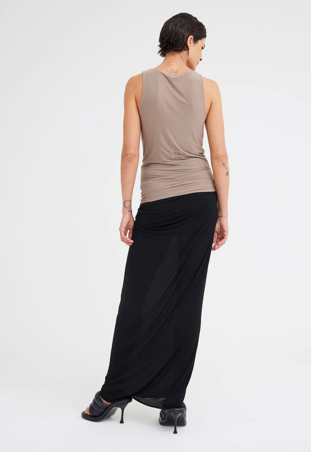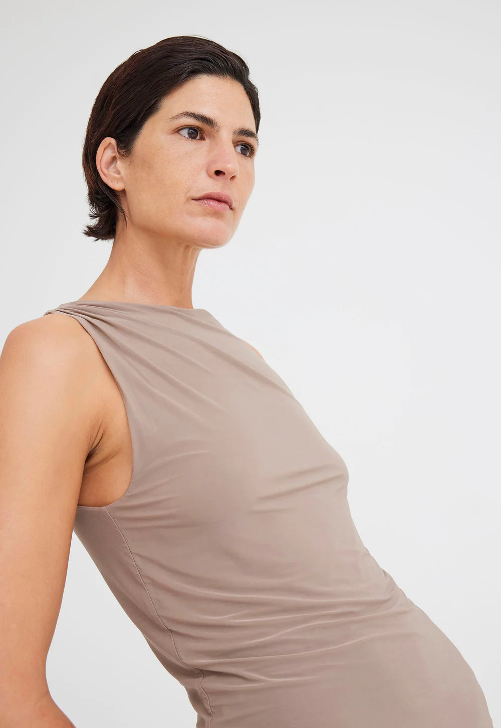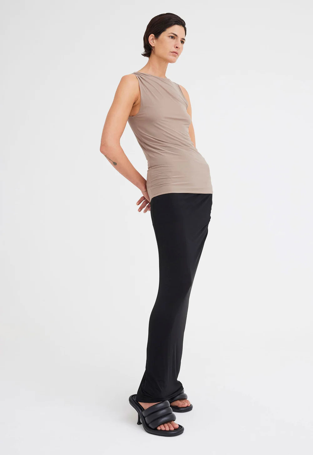 Cool and sophisticated, this slinky jersey tank is style and ease combined. With a high neckline, gathered shoulder detail and soft natural drape, the Italian jersey has a soft sheen and luxurious hand feel for a flattering fit and elevated feel. We love it styled back with our co-ordinating jersey pieces for an easy refined ensemble.