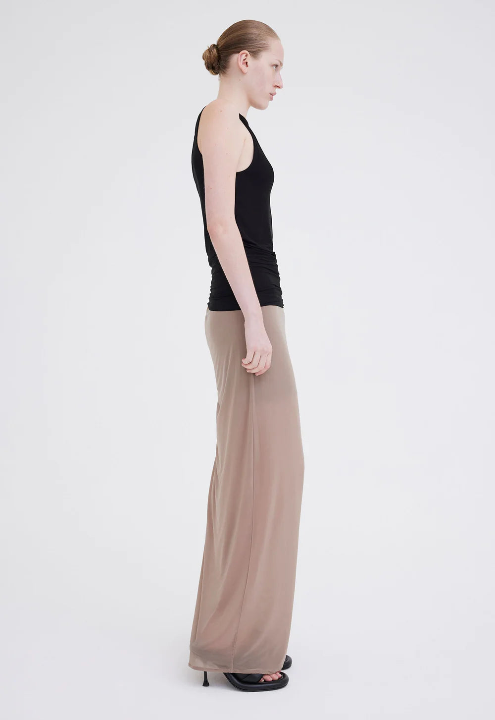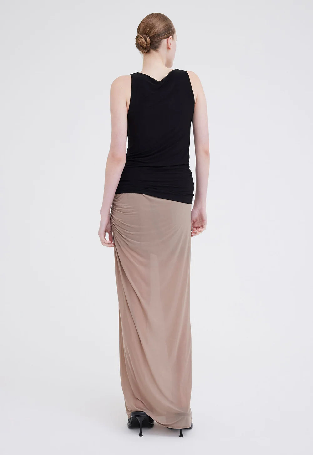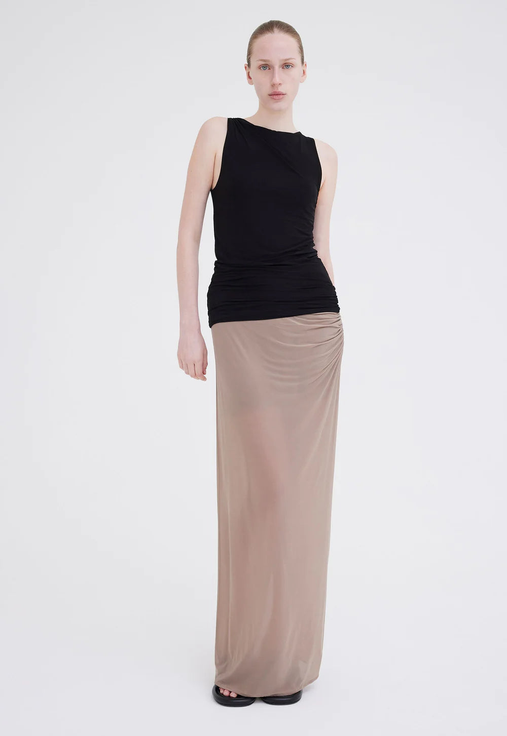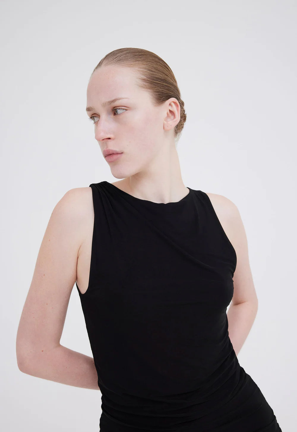 Cool and sophisticated, this slinky jersey tank is style and ease combined. With a high neckline, gathered shoulder detail and soft natural drape, the Italian jersey has a soft sheen and luxurious hand feel for a flattering fit and elevated feel. We love it styled back with our co-ordinating jersey pieces for an easy refined ensemble.