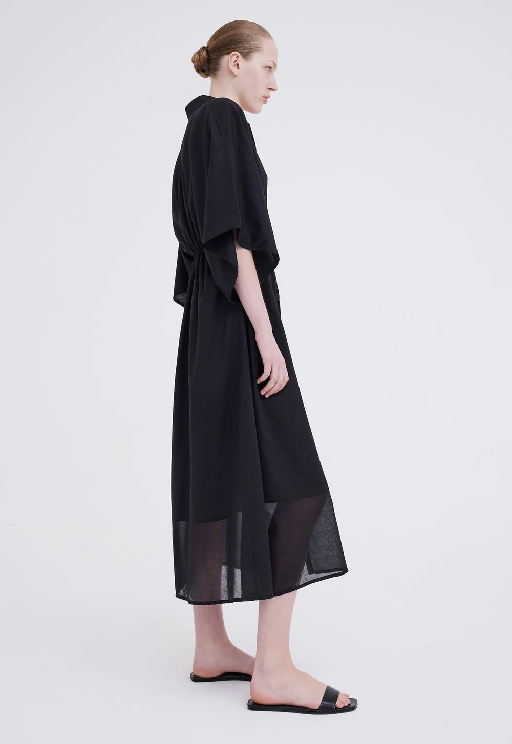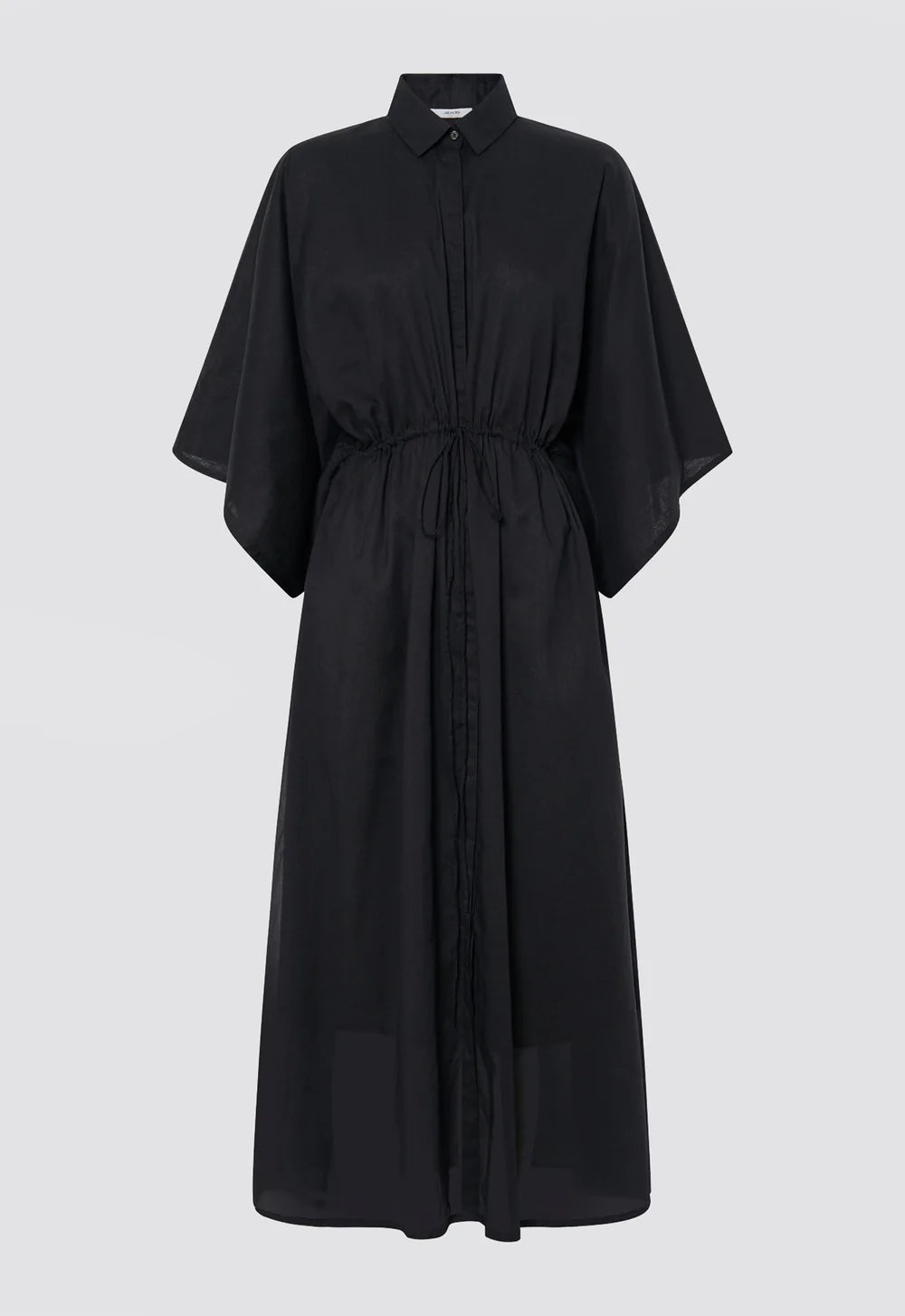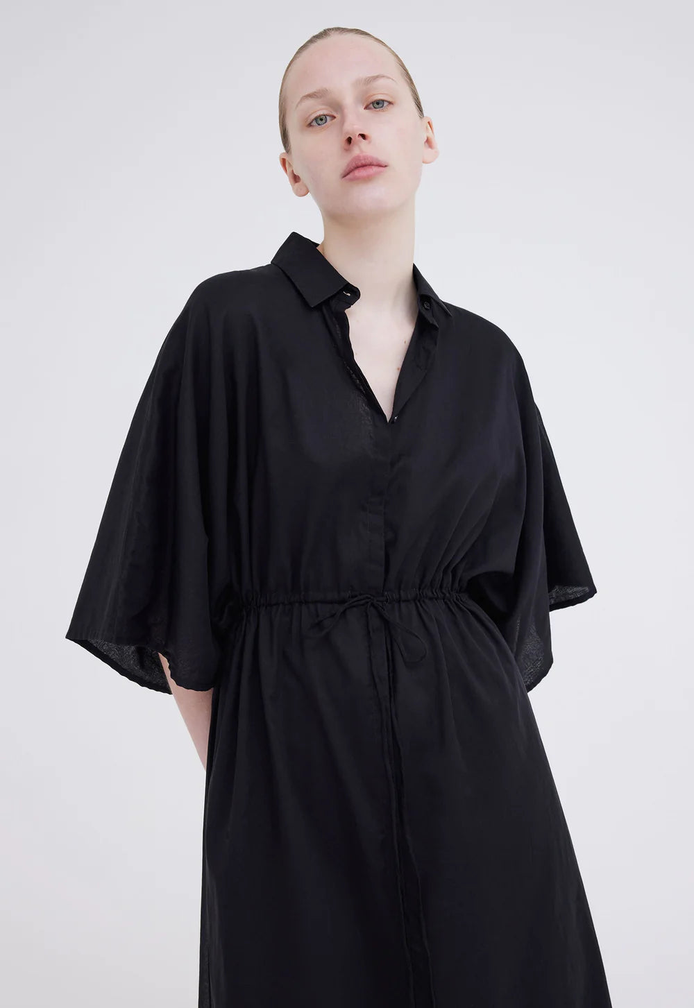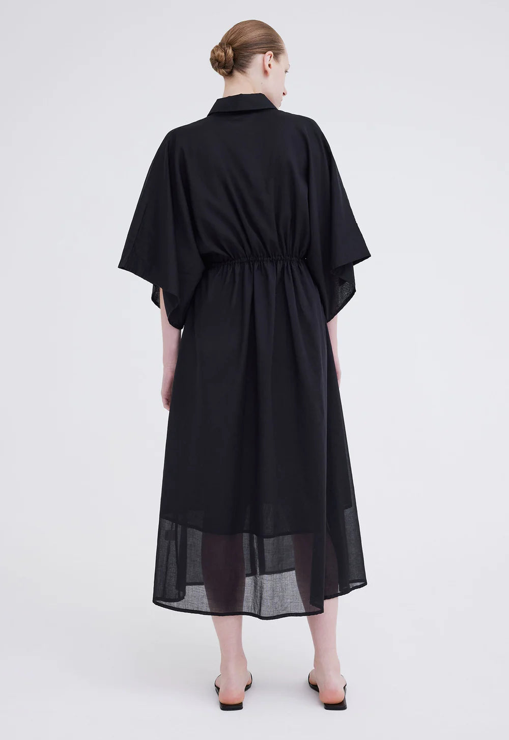 An airy midi dress for the warmer months ahead. This batwing sleeve shirt dress features a cinched waist and full skirt to highlight the silhouette. Cut from a soft, semi-sheer cotton this piece is relaxed elegance at its best.
