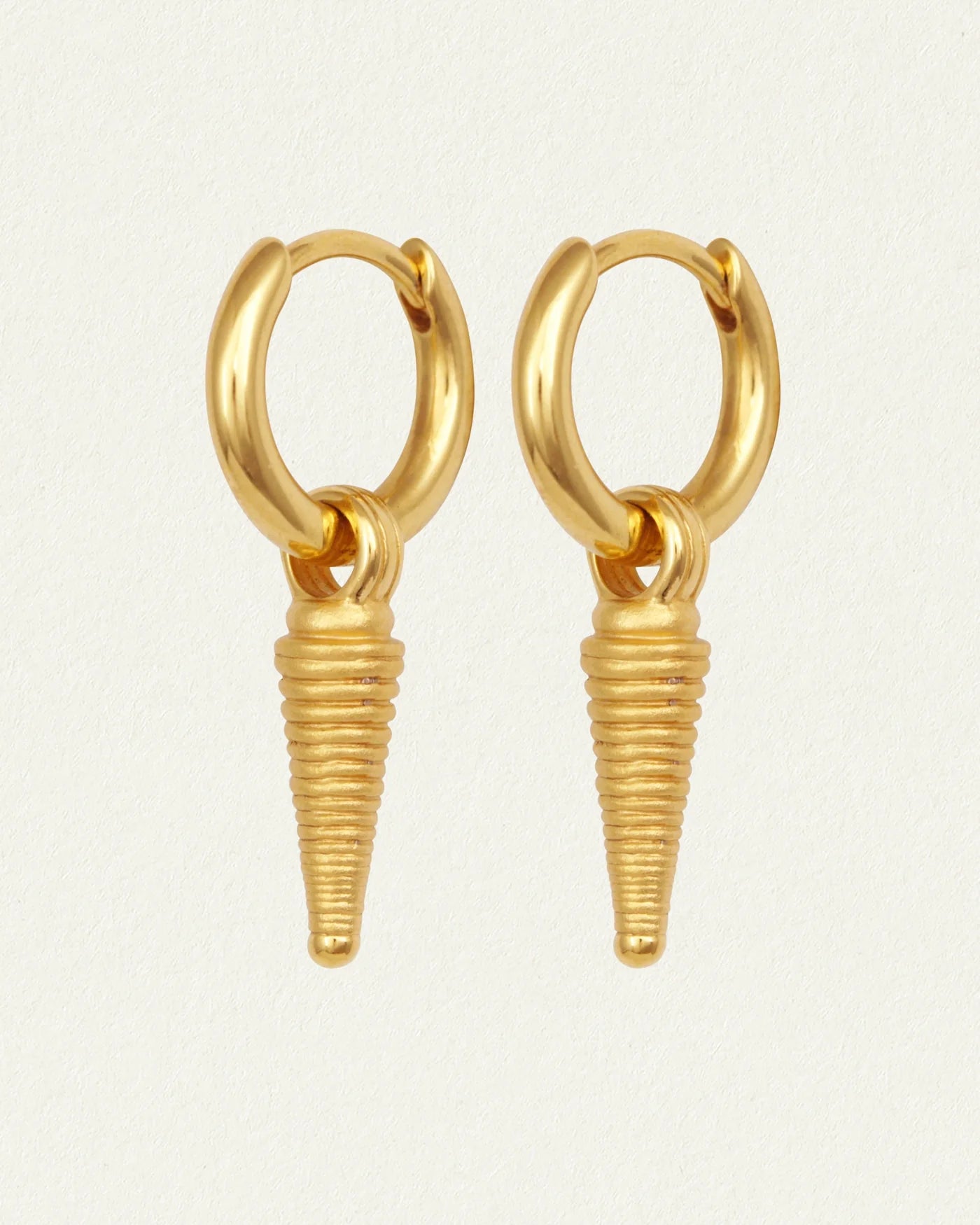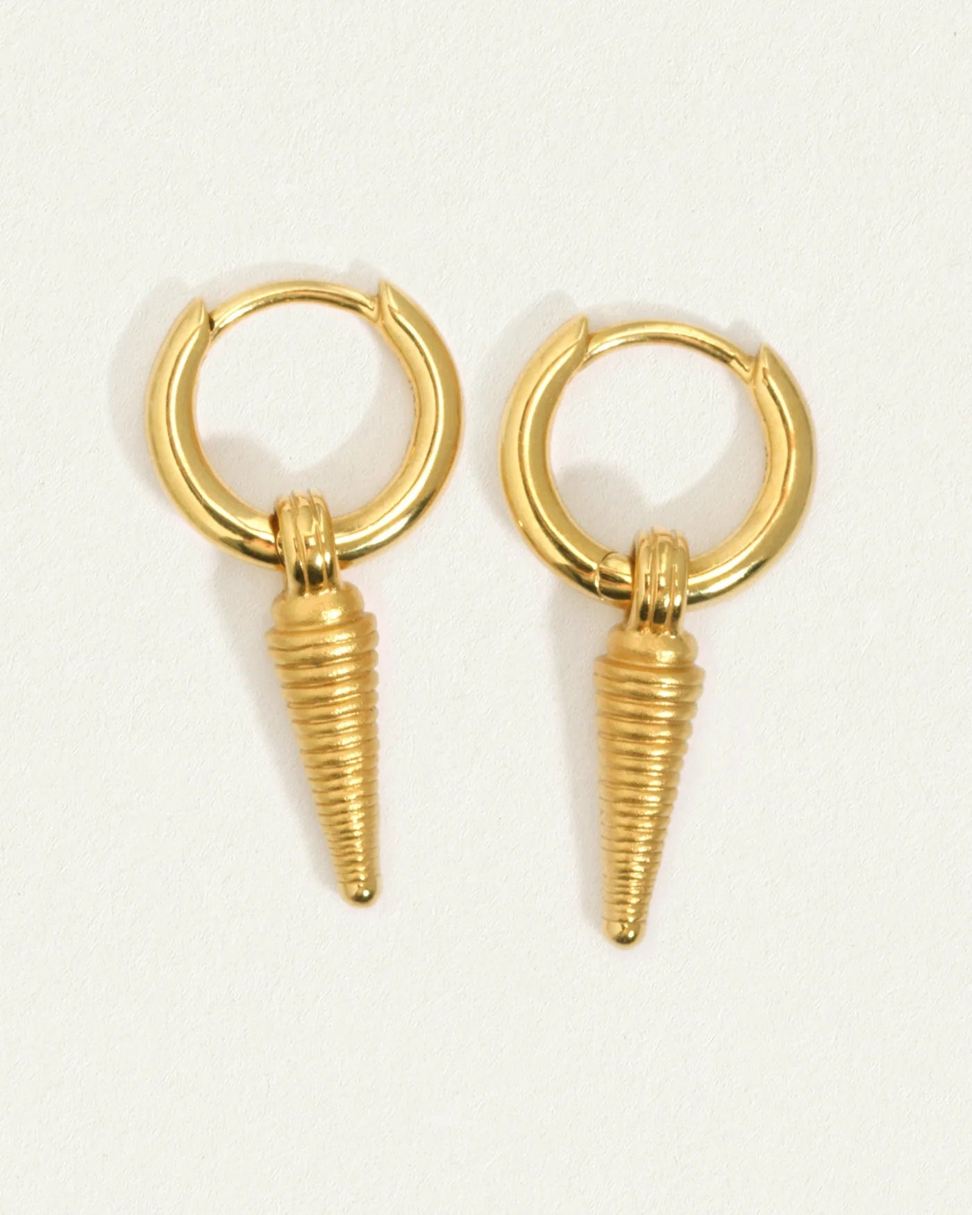 These 18k gold vermeil huggies feature captivating cone-shaped drops embodying the resonance of an echo.