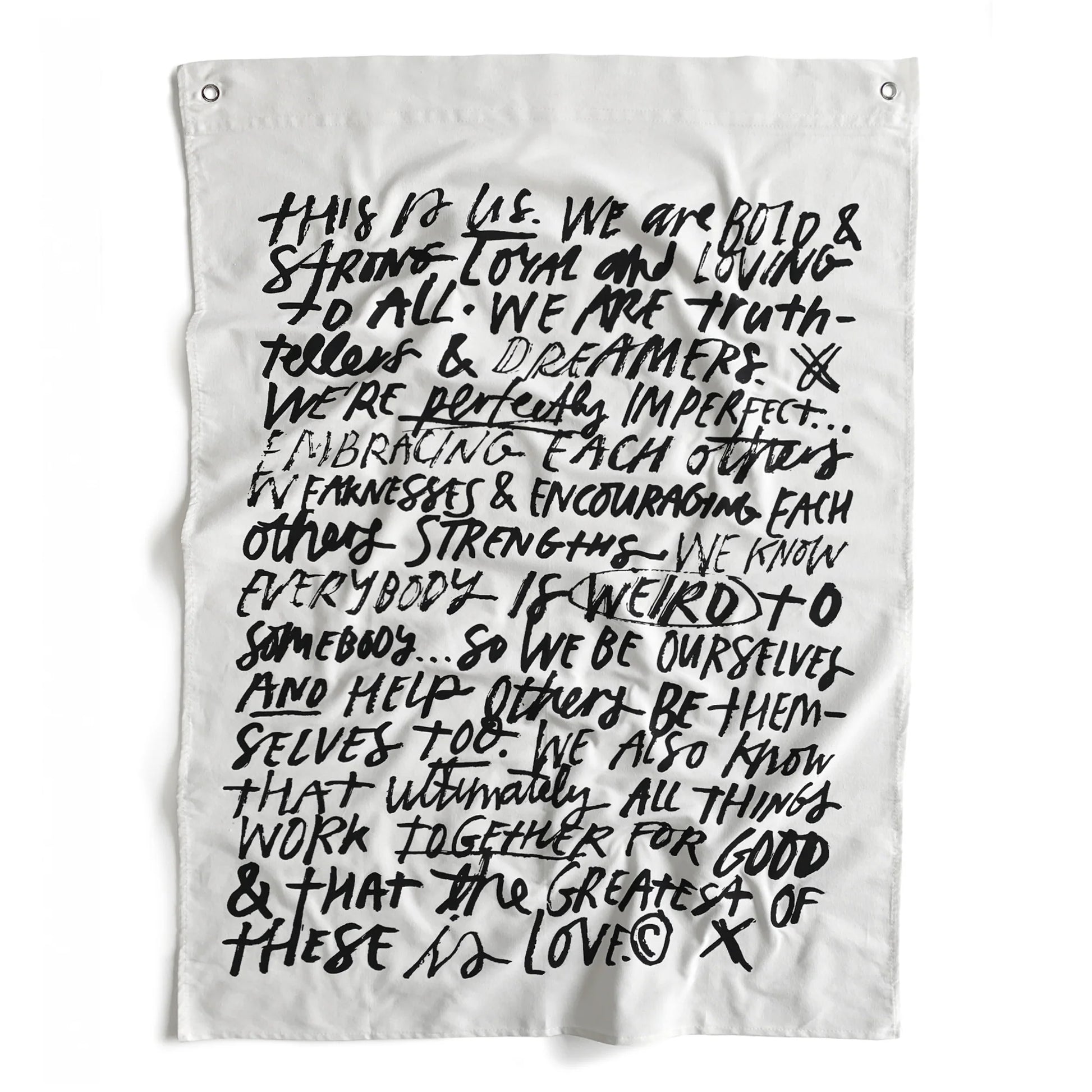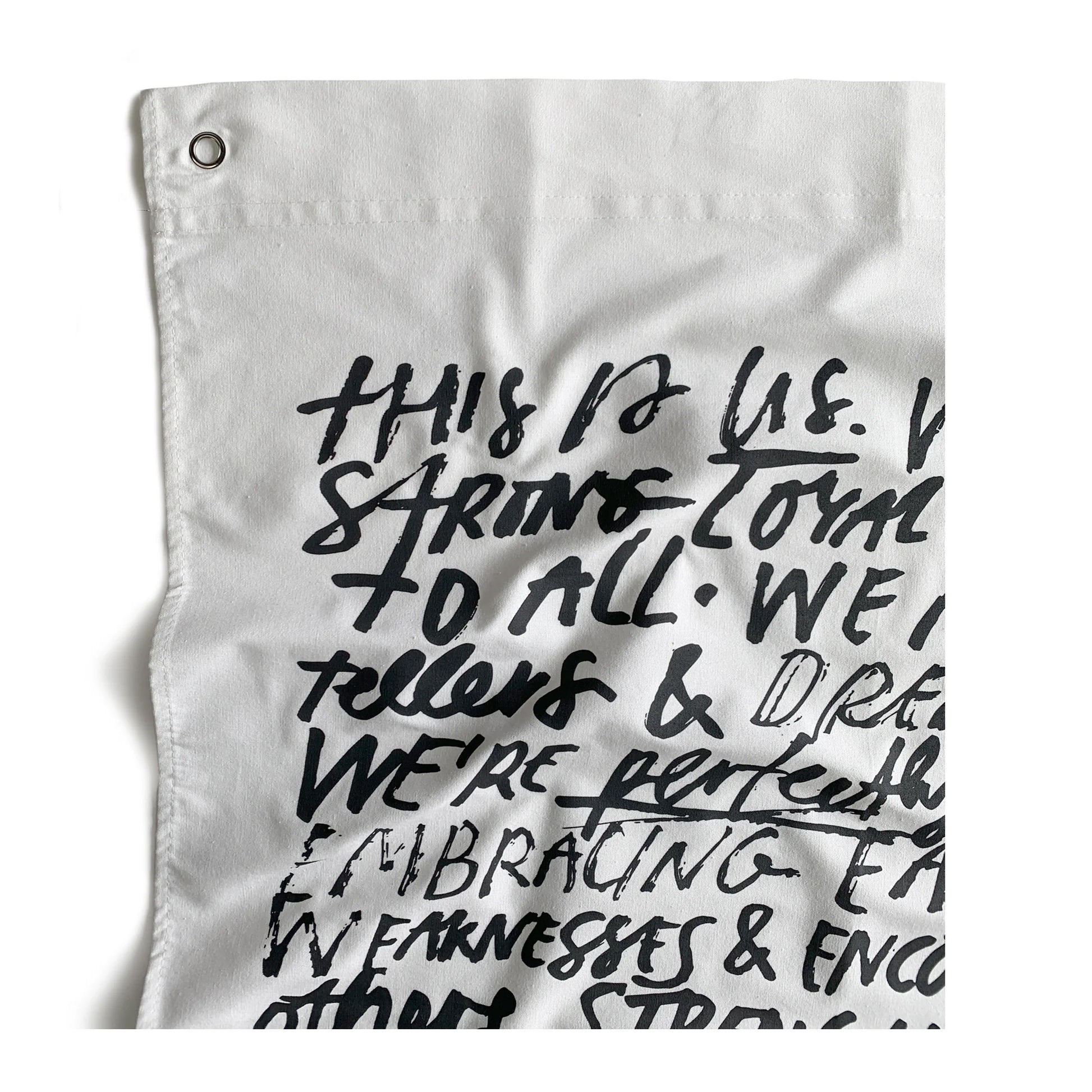Family Mantra wall flag. 90x120cm silk screen printed onto soft heavyweight cotton. Eyelets at the top for hanging, comes in custom Blacklist dust bag. Limited numbers.