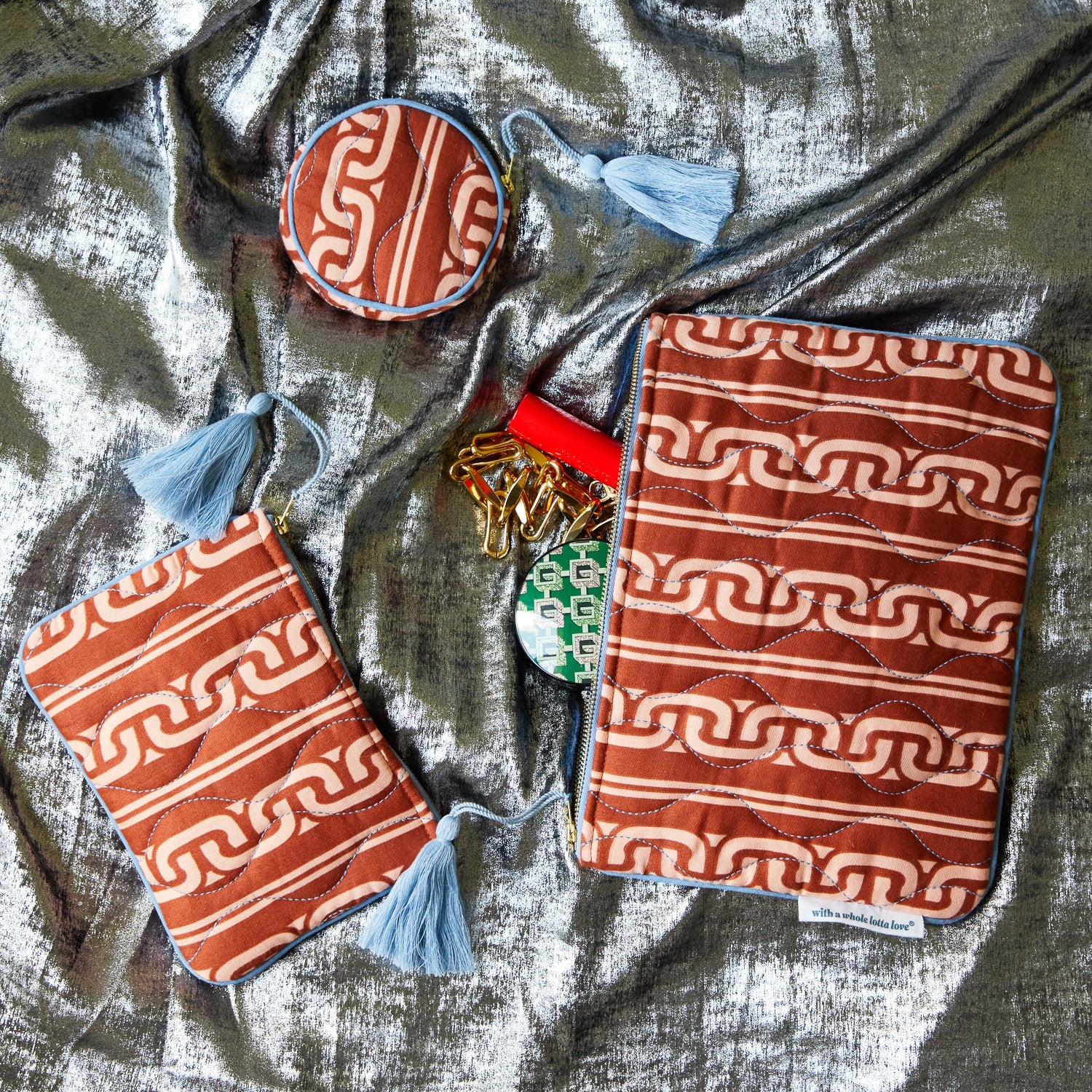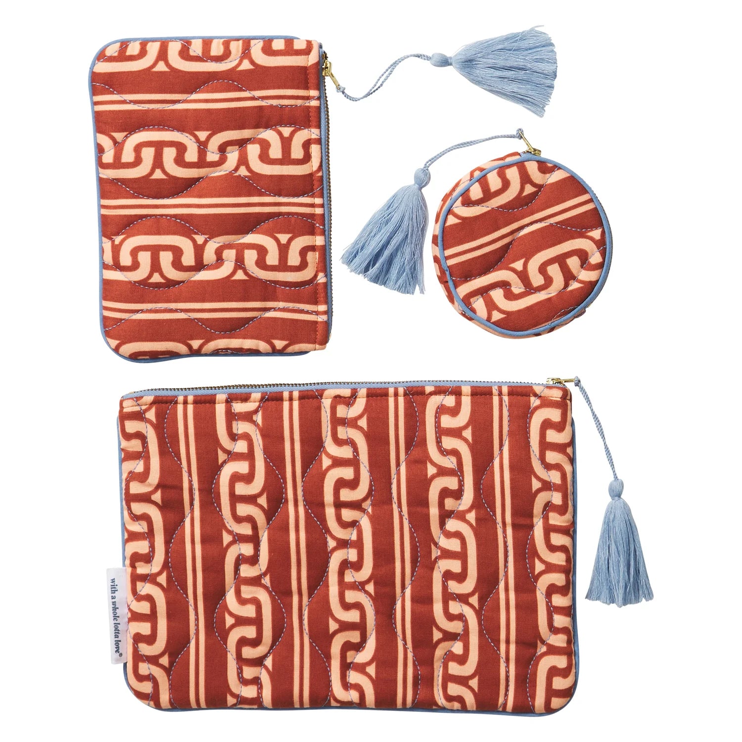 “Drawing inspiration from vintage Italianate prints, our eye-catching Fidel pouch set exudes stylish nostalgic vibes. These three practical quilted pouches are finished with contrasting zip closures and textural tassels for an added touch of playful joy.” – Phoebe’s Style Notes
