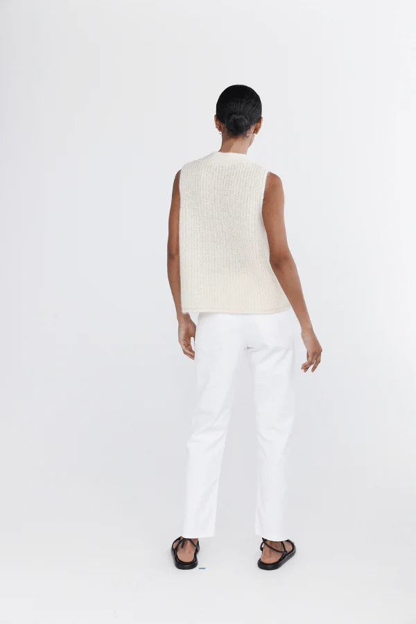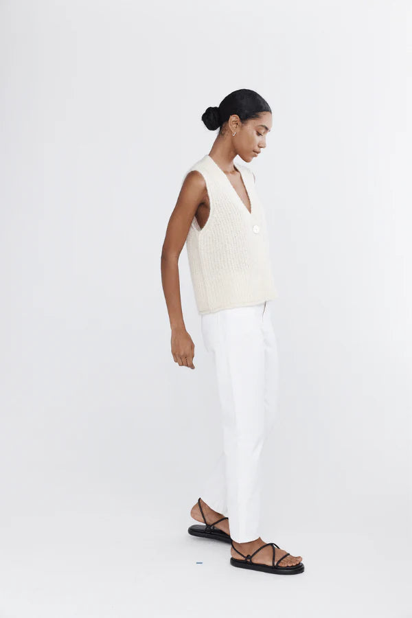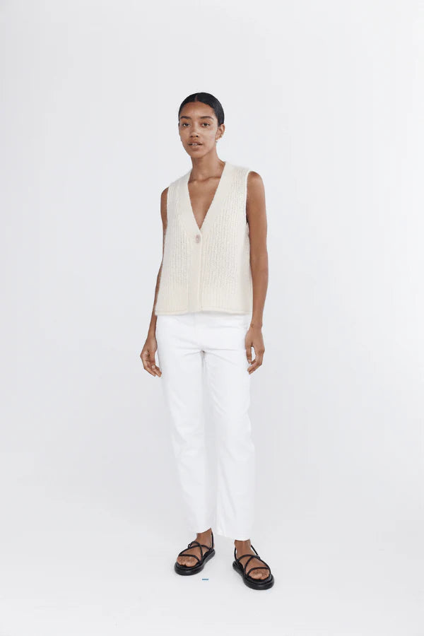 Built upon the iconic Jai cardigan from previous seasons, this knitted vest showcases a relaxed, boxy silhouette secured with a single shell button at the center front. Falling at a semi-cropped length, the vest features a roll hem that adds a subtle curve to its design.