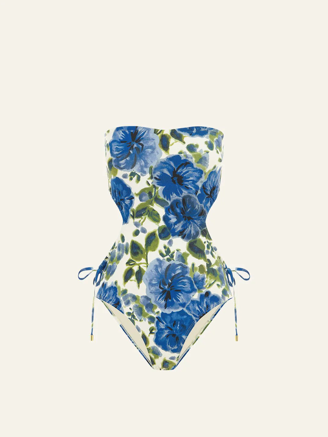 A statement one—piece from Peony's rehearsal collection, the Strapless Cut Out is a vacation hero. A beautiful balance of simplicity with refined detailing. Perfectly placed cut outs are framed with functional ties and soft ruching with pops of skin.