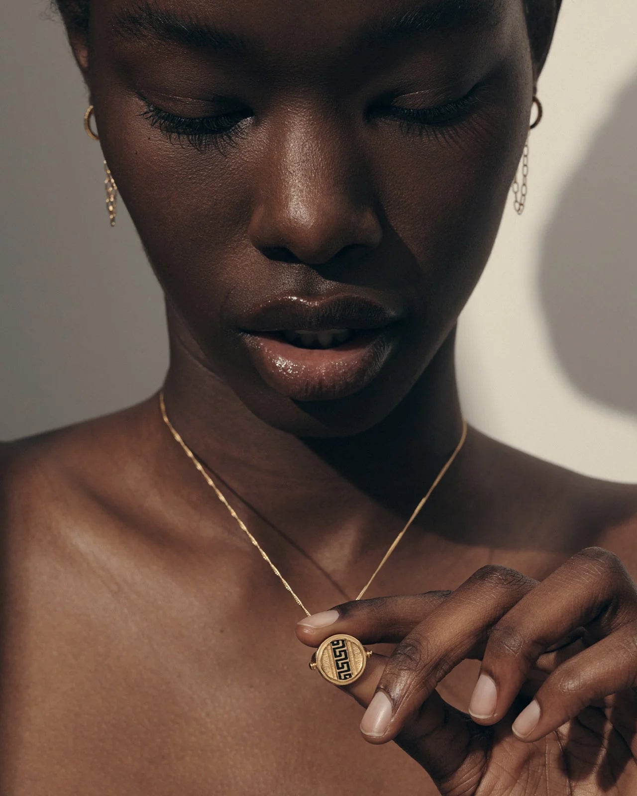 The Meander Necklace is an 18k gold vermeil spinner necklace. Inspired by ancient Greek geometrical pottery, this double-sided pendant is inlaid with black onyx and can be flipped to reveal a Greek key motif articulated in black enamelling on a warm golden background.