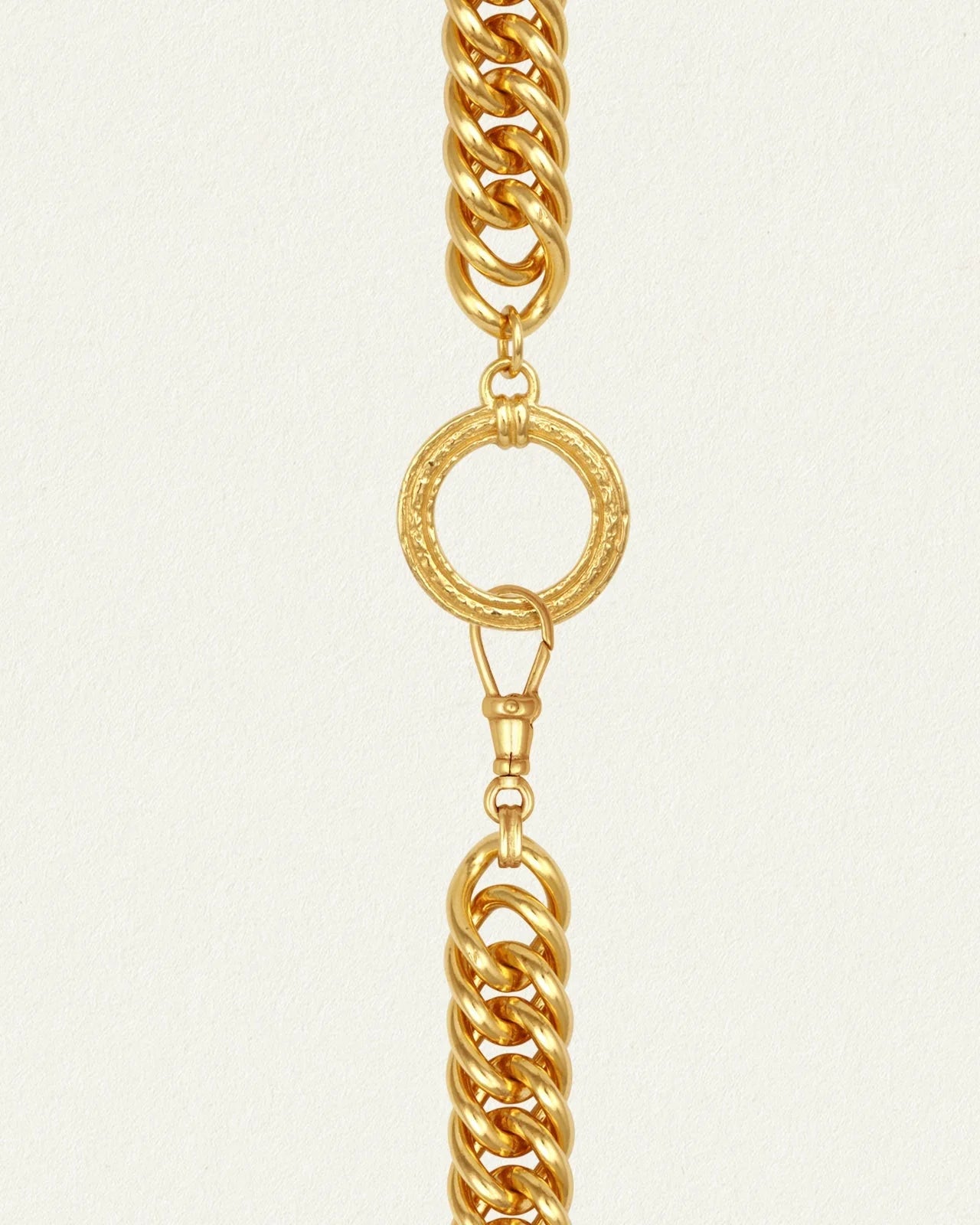 Ascend to Olympus with this bold statement bracelet crafted from 18k gold vermeil. The double curb chain is accentuated by a textured ring and swivel clasp, forming a divine example of functional aesthetics.