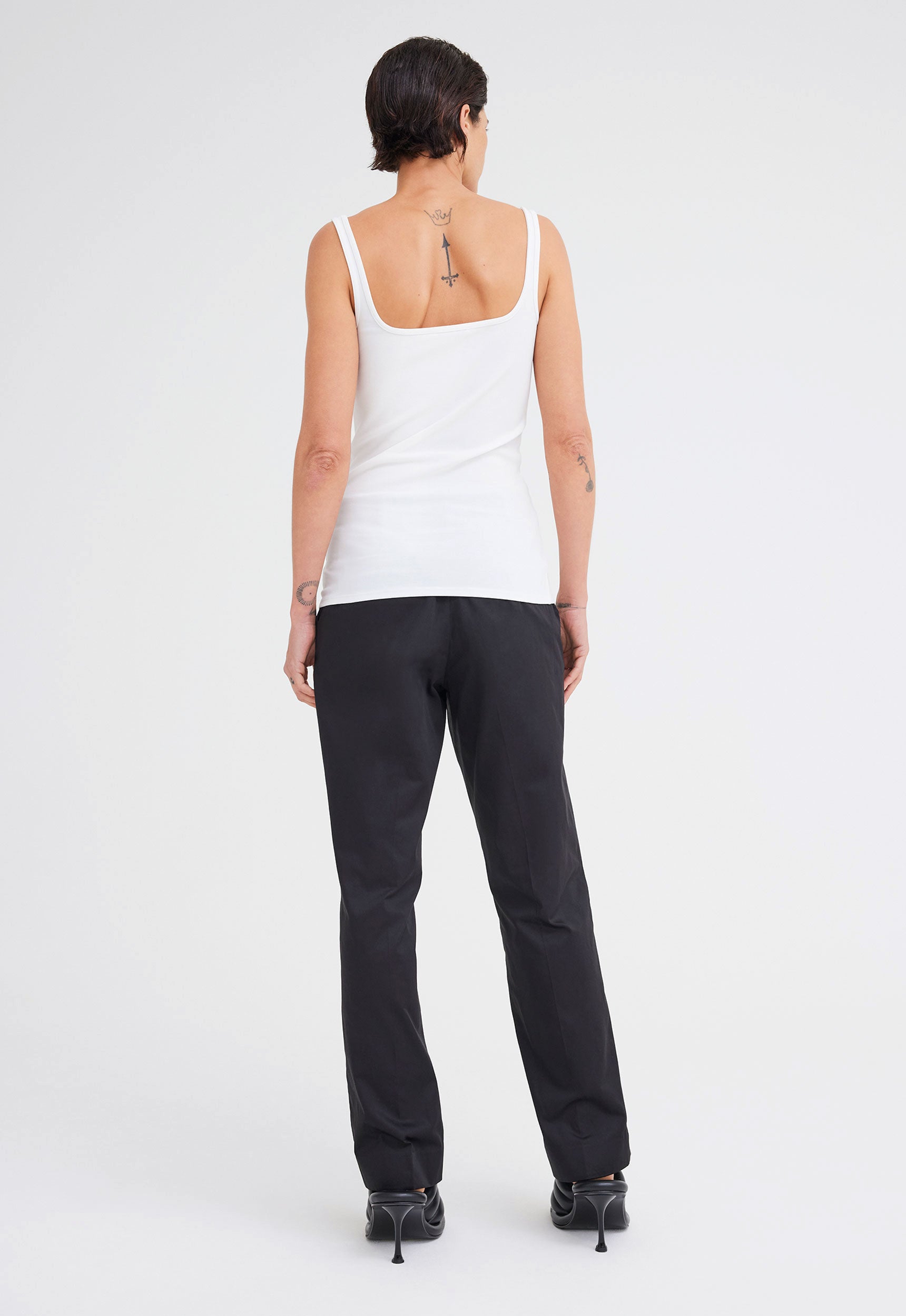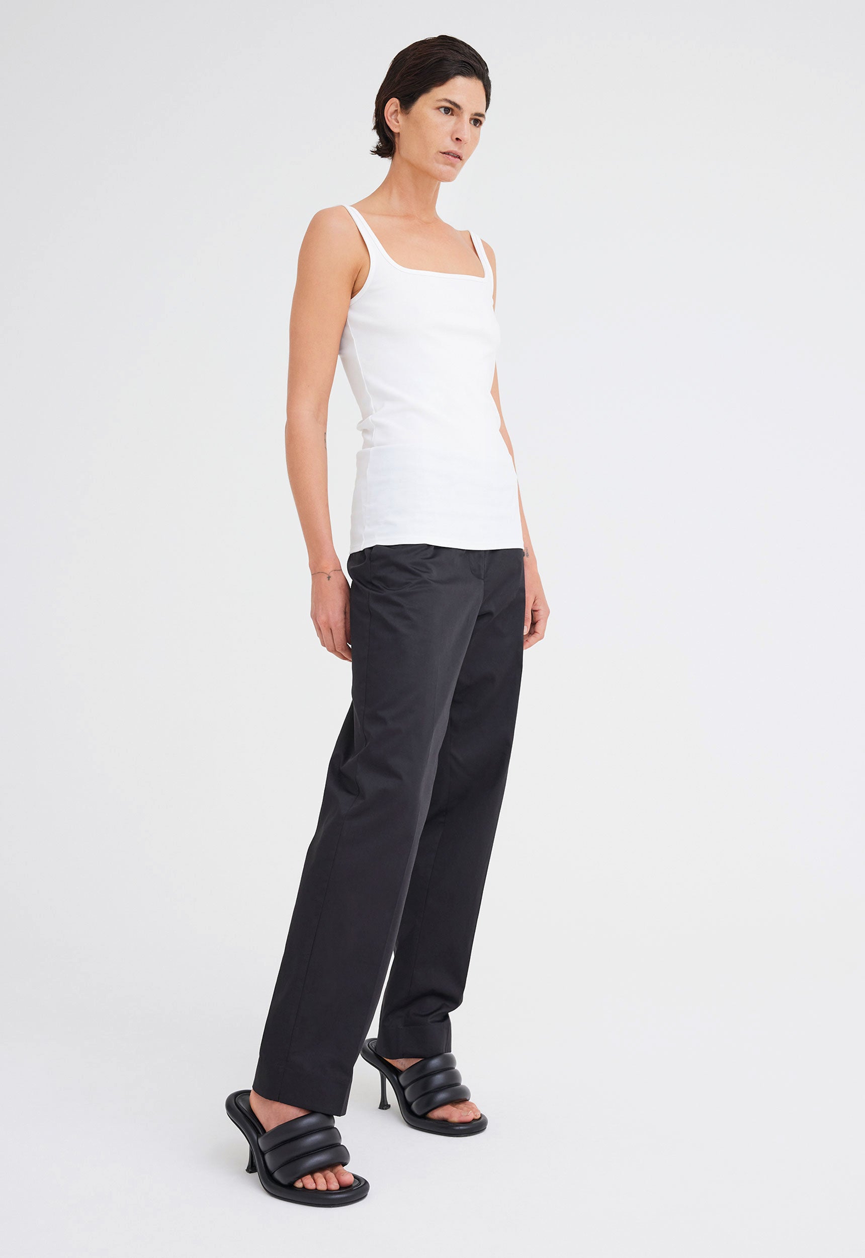 An elevated essential, this ribbed tank top is crafted from a fine mercerised organic cotton jersey. With a squared neckline, thing shoulder straps and a fitted silhouette, this is a style that will carry you season to season.