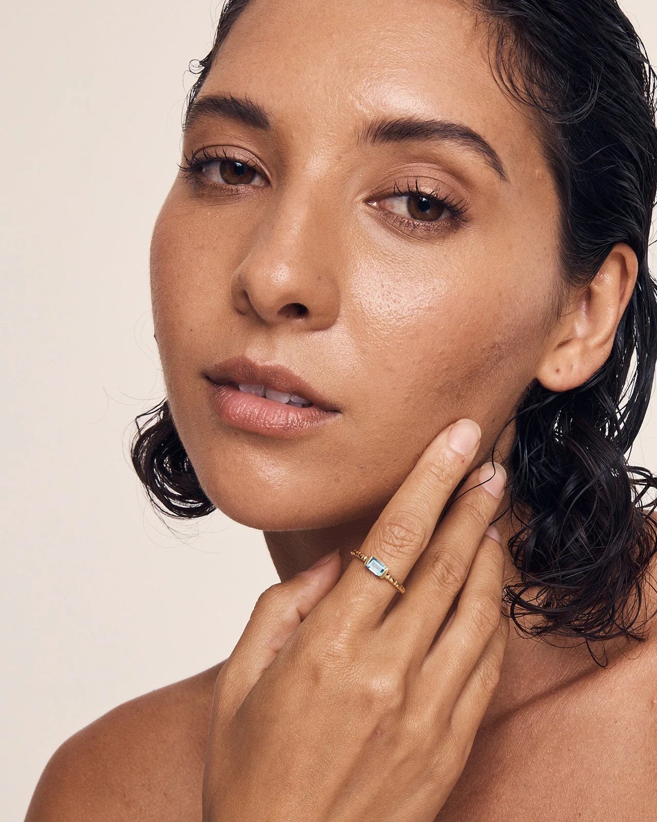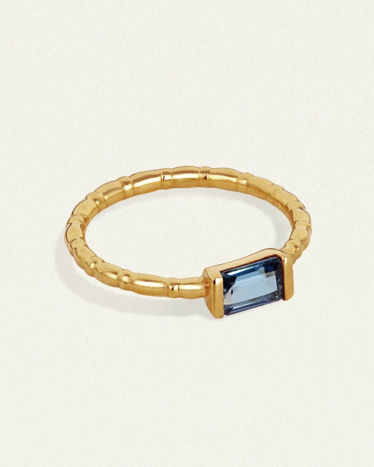 A band of 18k Gold Vermeil polished gold with hand-carved textures meets a shimmering emerald-cut London Blue Topaz at the centre of your finger. The cut of this cooling and calming blue topaz creates a glistening sea of sparkling dimensions as you move your hand.