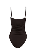 The Raya bandeau One Piece in Black is an understated design with undeniable appeal. Made from BB's luxurious Embodee™ fabric, Raya flatters the body, gently shaping and enhance the silhouette. This flattering design features a gathered bodice, straps detach so the suit can be worn strapless and invisible under-bust support. Wear Raya to the beach by day or style with Linen Pants for an elevated evening look.