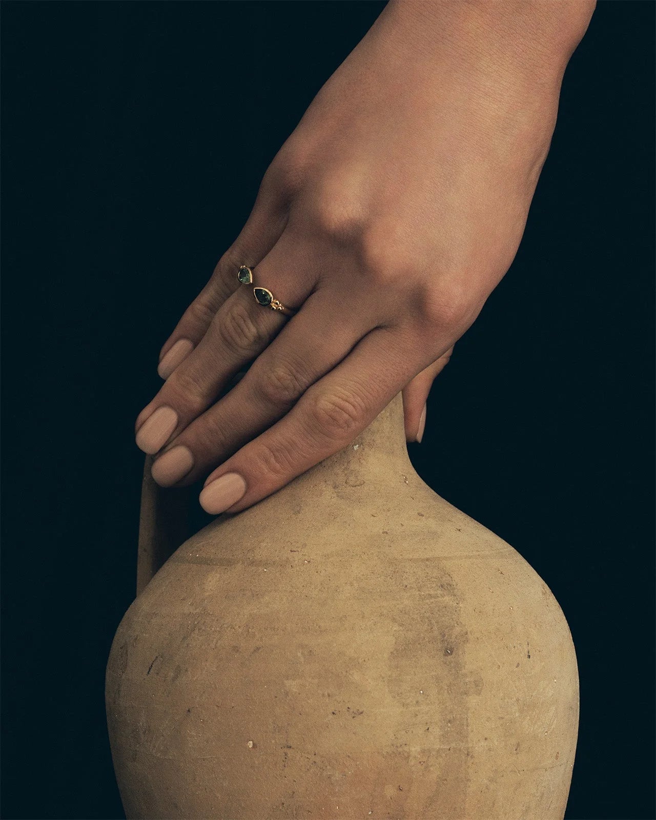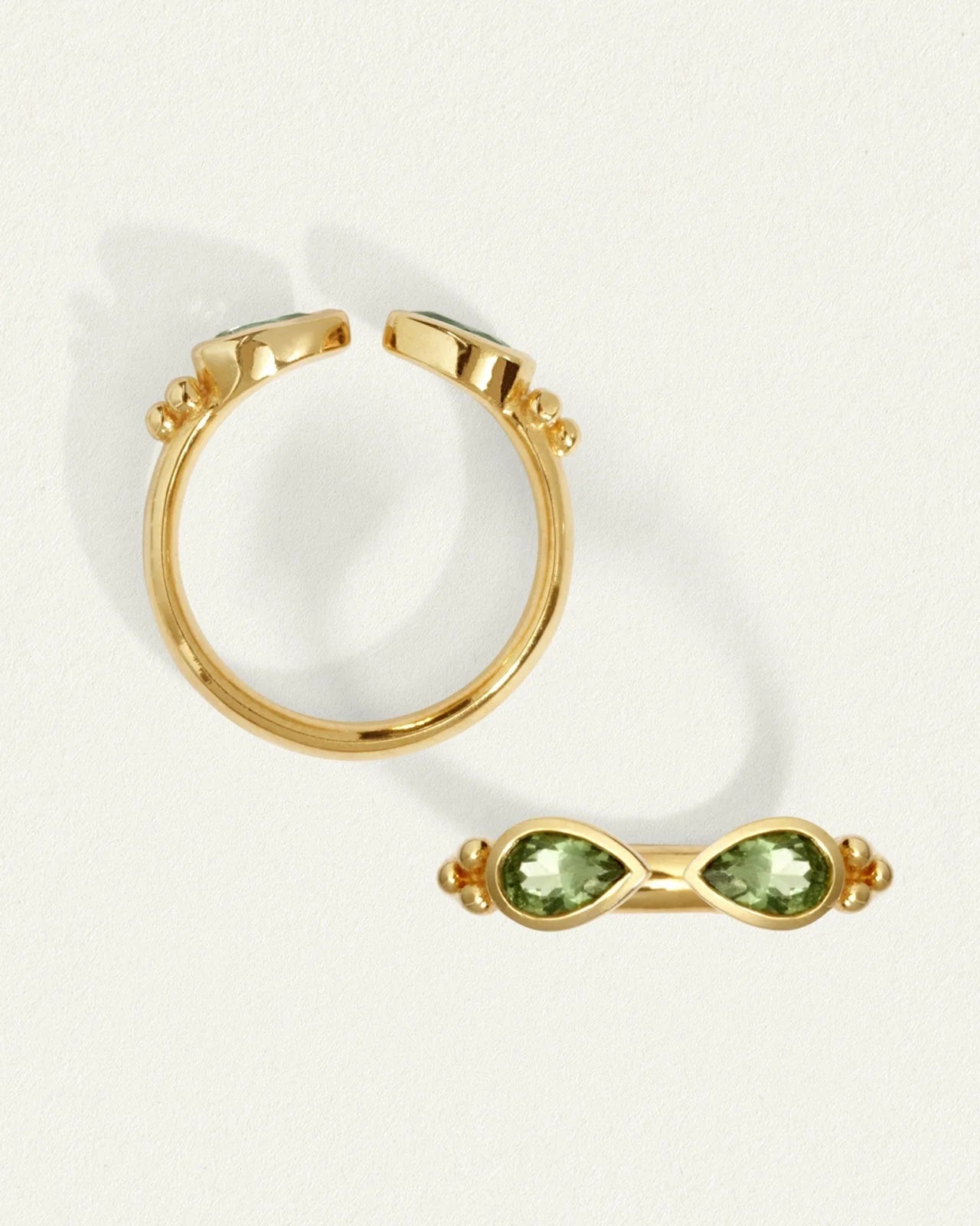 The Sarra Ring Apatite Gold in 18K Gold Vermeil is adorned with two pear cut Green Apatite gemstones. The Green Apatite represents abundance and new growth, honouring Persephone the goddess of Spring. An open circle, the Sarra Ring Apatite Gold speaks to possibilities and the vitality of renewal.