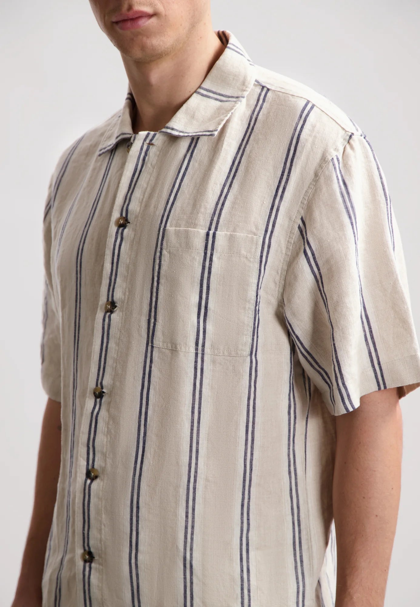 featuring a stylish double-lane stripe in 100% linen. The ultimate go-to uniform – perfect with the matching James Pants Linen Stripe or James Shorts Linen Stripe