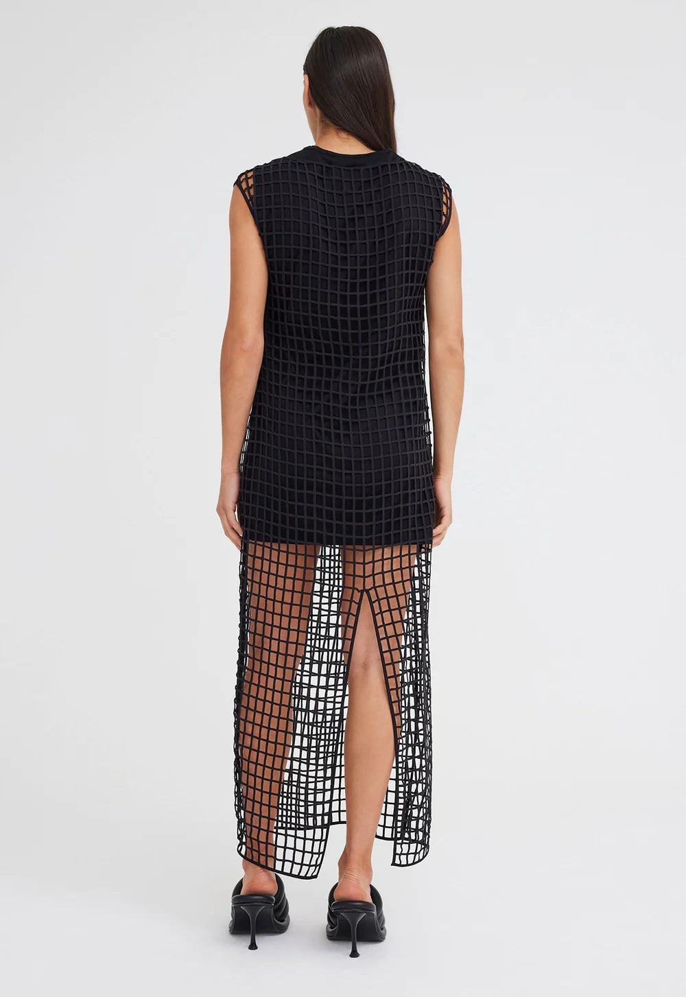 This cotton mesh shift dress is a new season hero. With a relaxed easy fit, midi length and back split, the refined silhouette allows the open grid pattern to be the true stand out of the piece. Sheer sensual dressing in a bold new way.