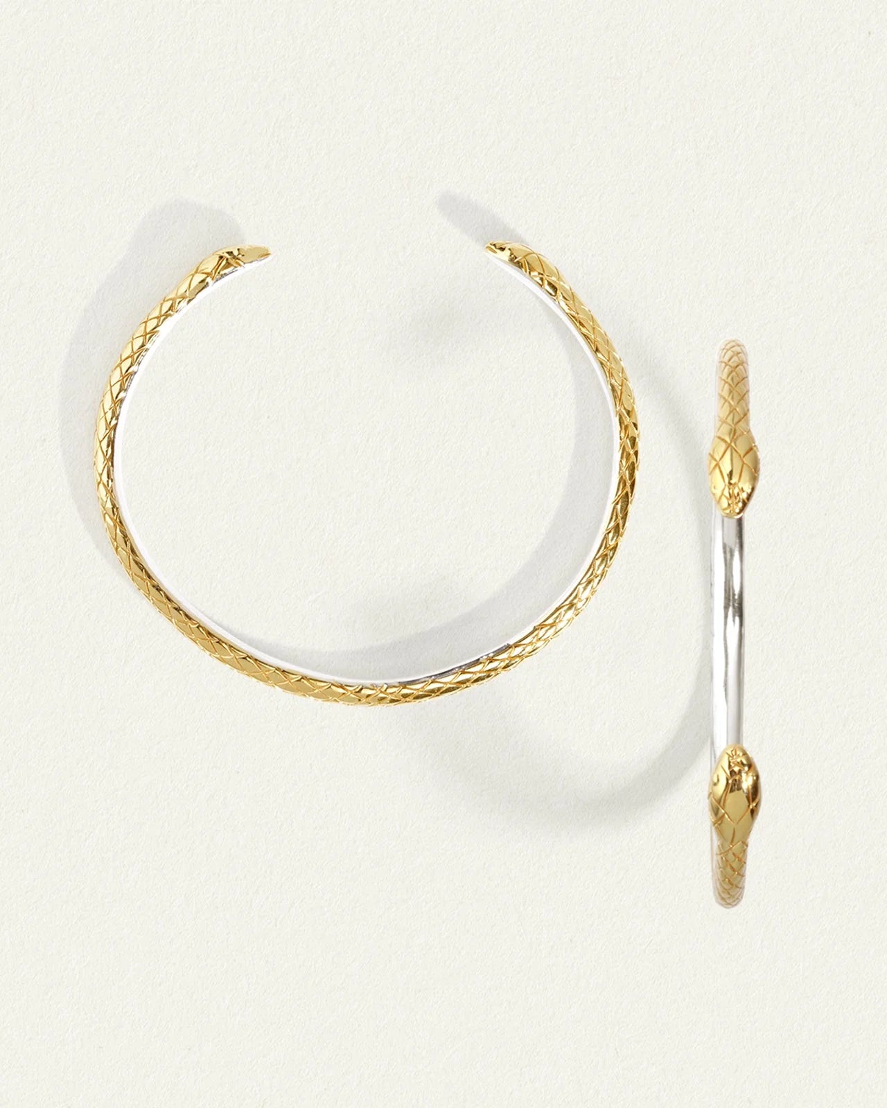The serpent is one of the oldest and most widespread mythological symbols. Snakes are worshipped as guardians of the great goddess, mysteries of birth and regeneration. The Serpent Cuff is a double-headed serpent of polished 18K Gold Vermeil with a delicate underbelly of Ethical Sterling Silver. The serpent's heads meet eye to eye at the center of your wrist.