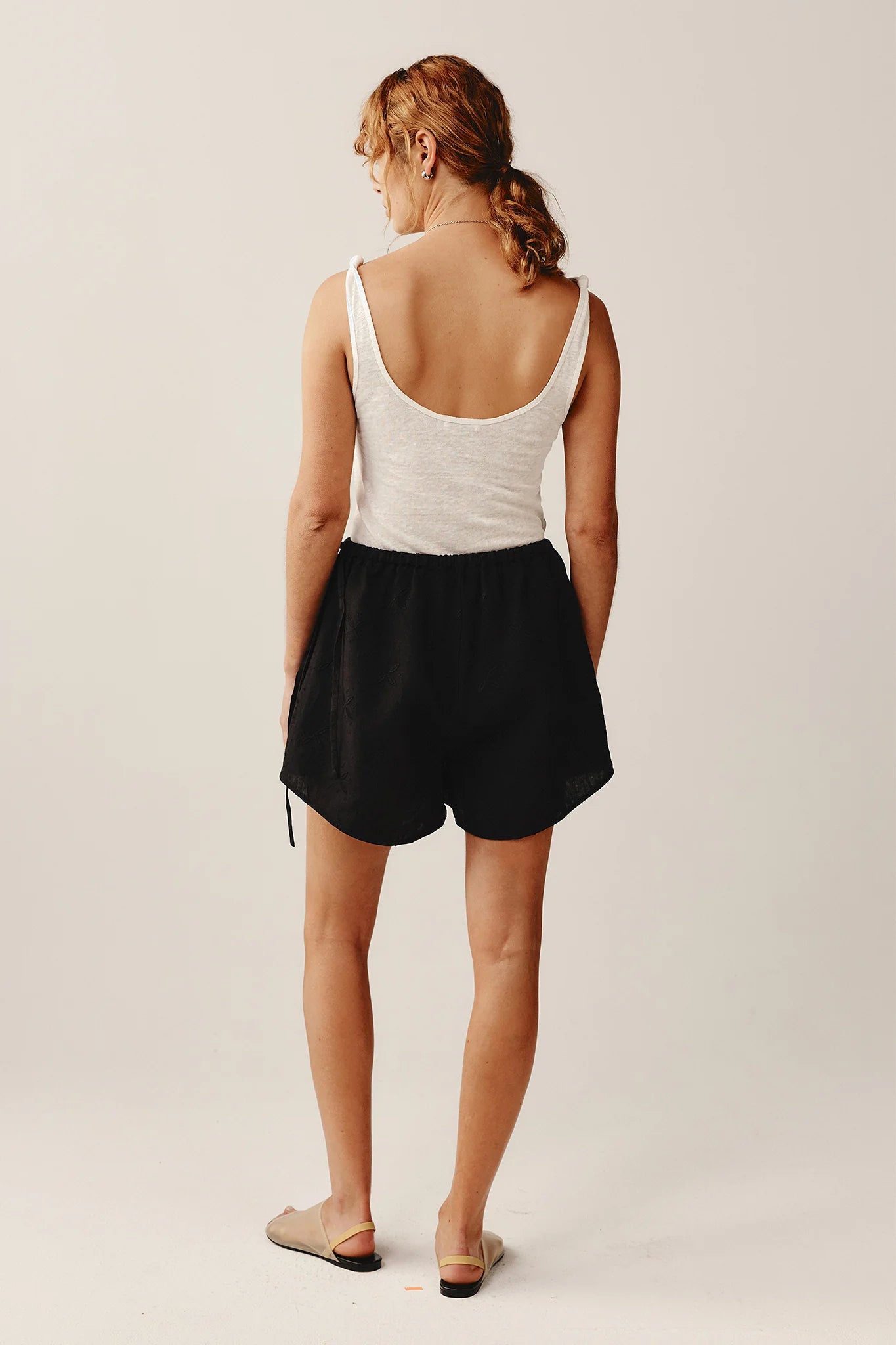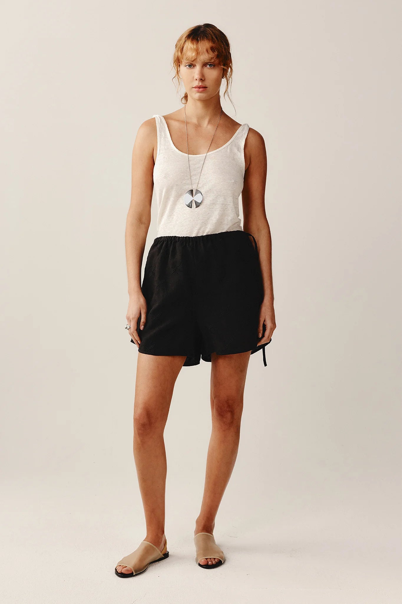 The Silla are the perfect short for the warmer months ahead. They sit on a thin waistband, secured by a drawstring that ties at the side. They feature a simple silhouette, with a subtle curve hem at the side. This version are crafted in a 100% linen cloth, finished with an embroidered flower motif, creating a subtle and tonal texture.