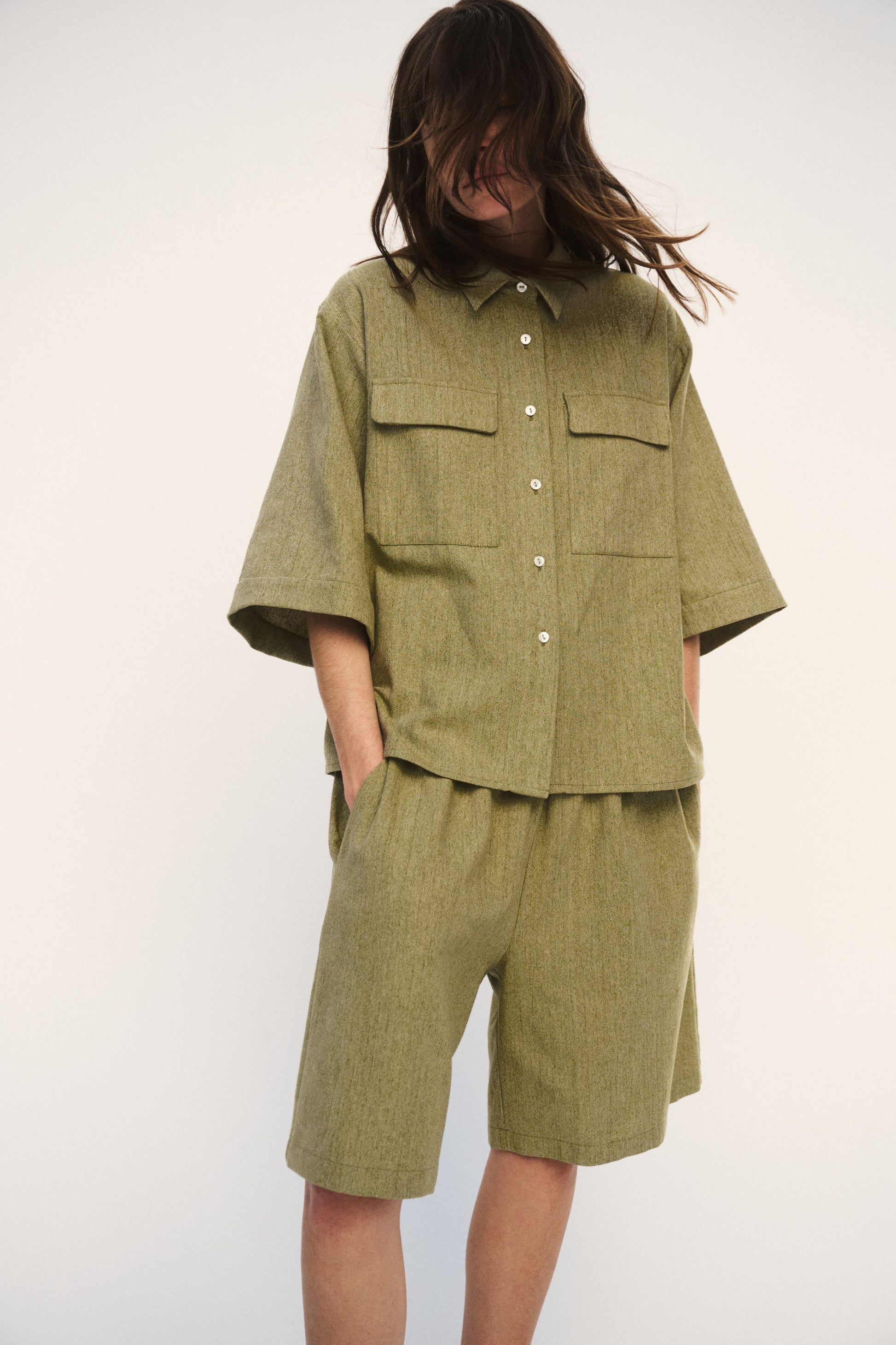 Matin's relaxed shorts in a moss-hued textured cotton designed with side-entry pockets and an elasticised waistband designed to be worn on relaxed summer days with the coordinating shirt, or layered over our minimal swimwear.