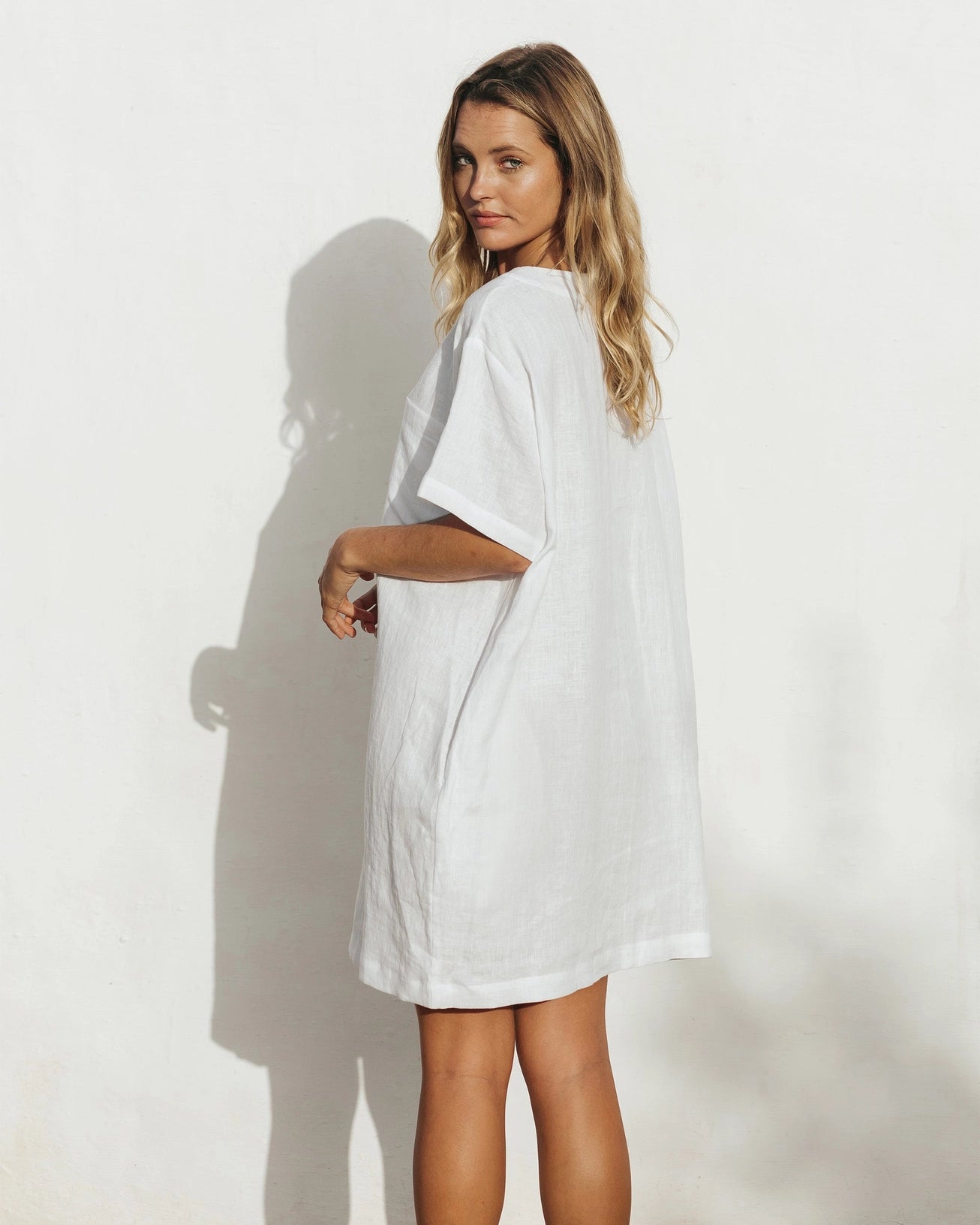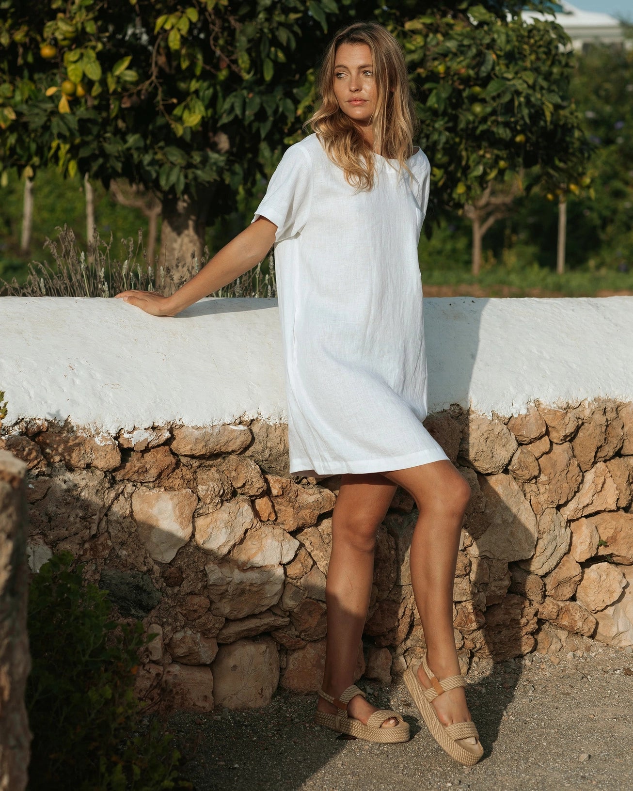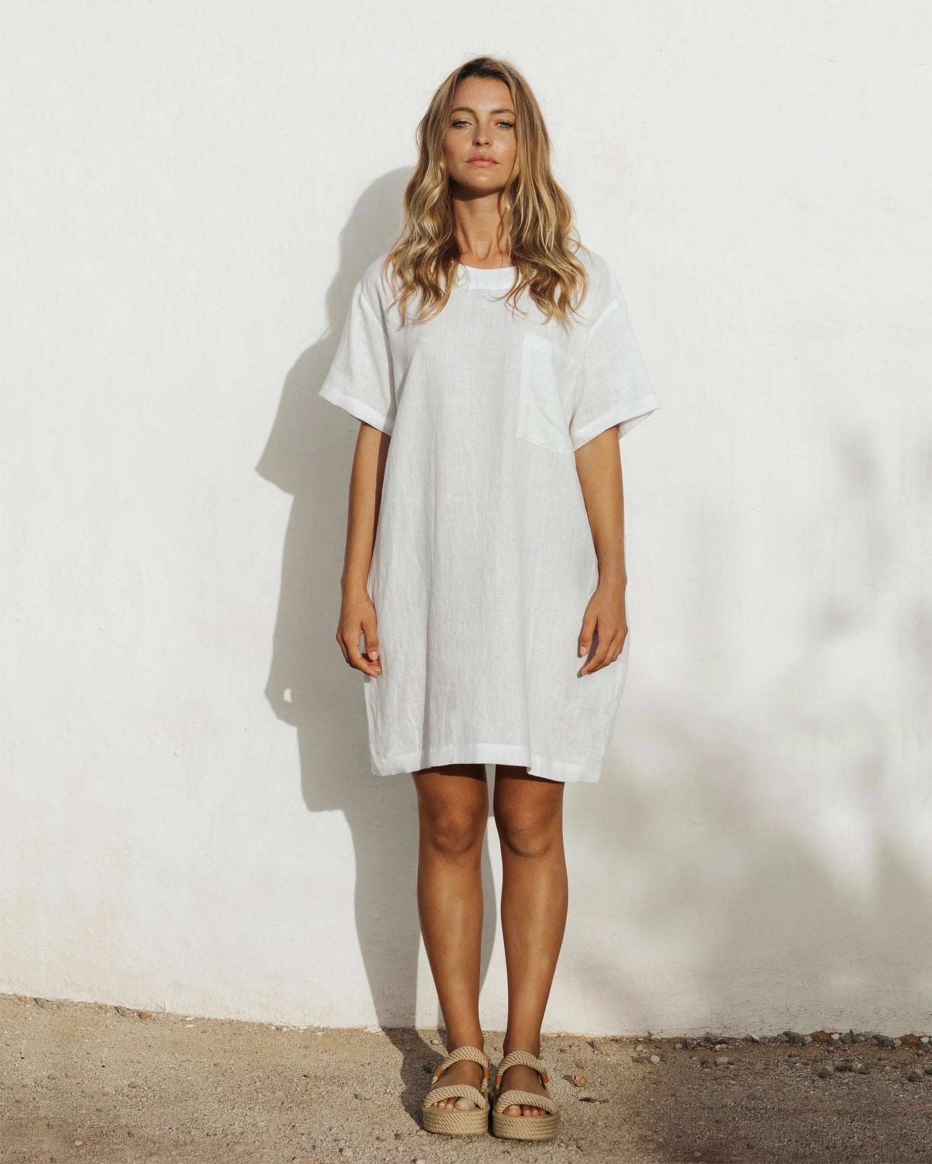 - Easy breezy. That is the feeling you get when wearing a linen T-Shirt dress MIJAS in White. Perfectly balanced for summer strolls – it keeps you cool and protects your skin from s. Easy to style – wear it alone with sandals or sneakers, on a colder day – pair it with l linen pants.