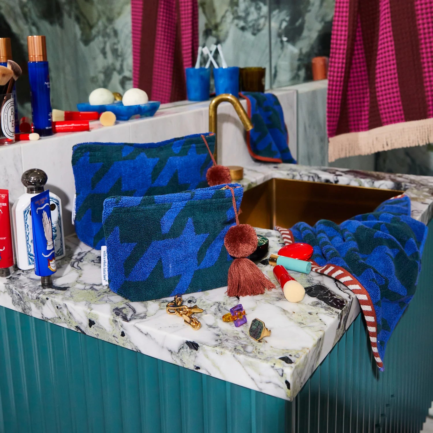 “A timeless design and unexpected colour pairings are the hallmarks of the fun and functional Vinita terry pouch. Rich hues and houndstooth combine to form this mood-boosting pouch, perfect for adding personality to your bathroom and travel essentials.” – Phoebe’s Style Notes