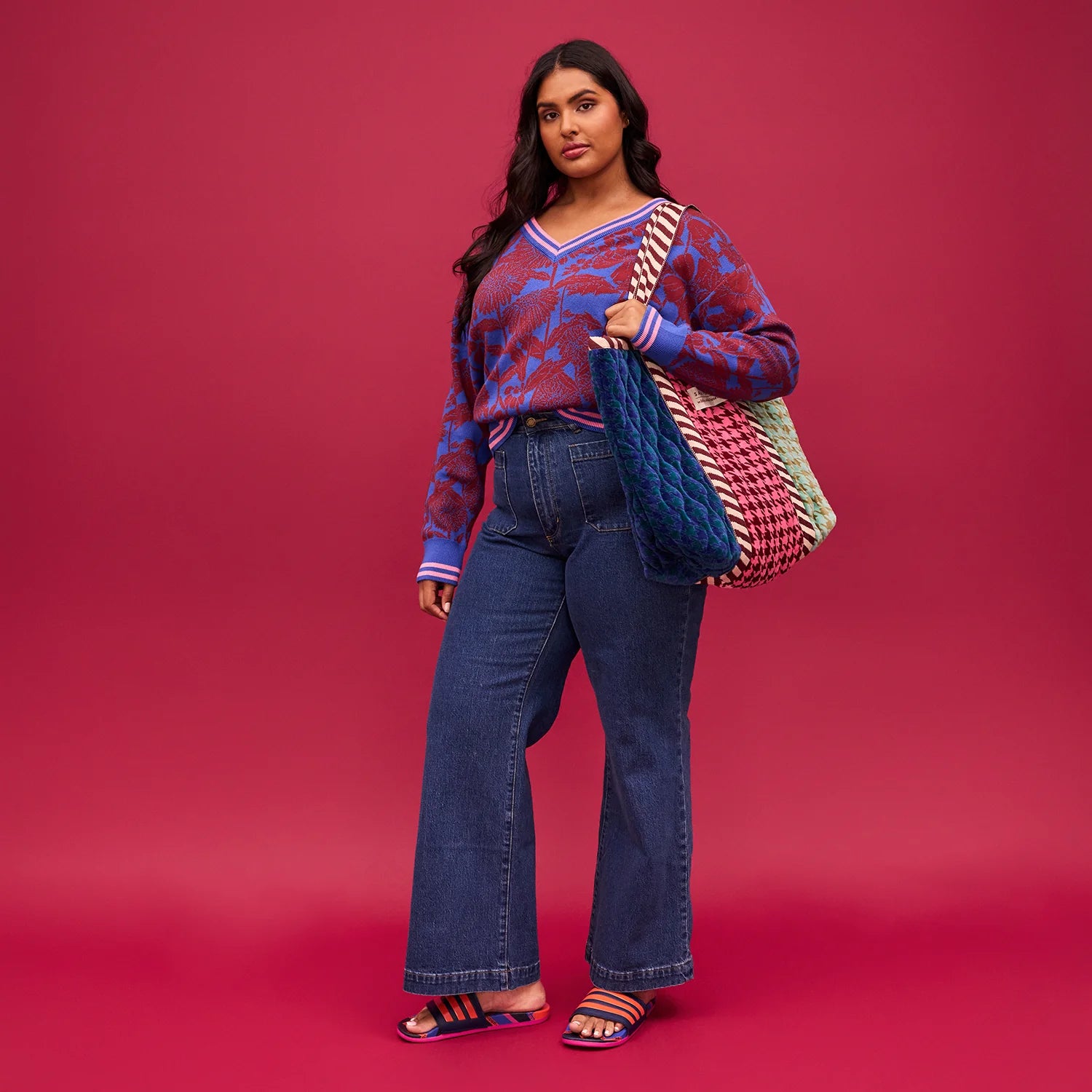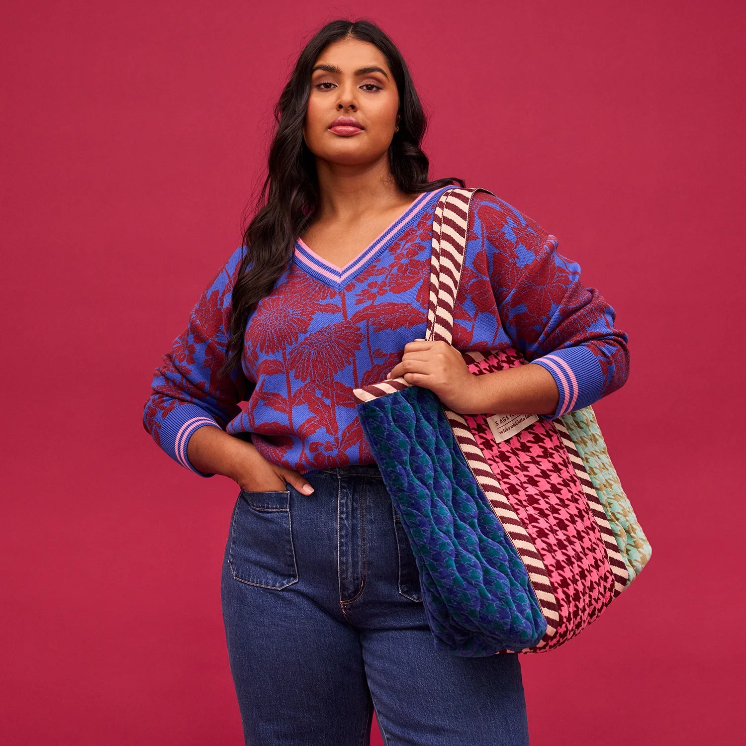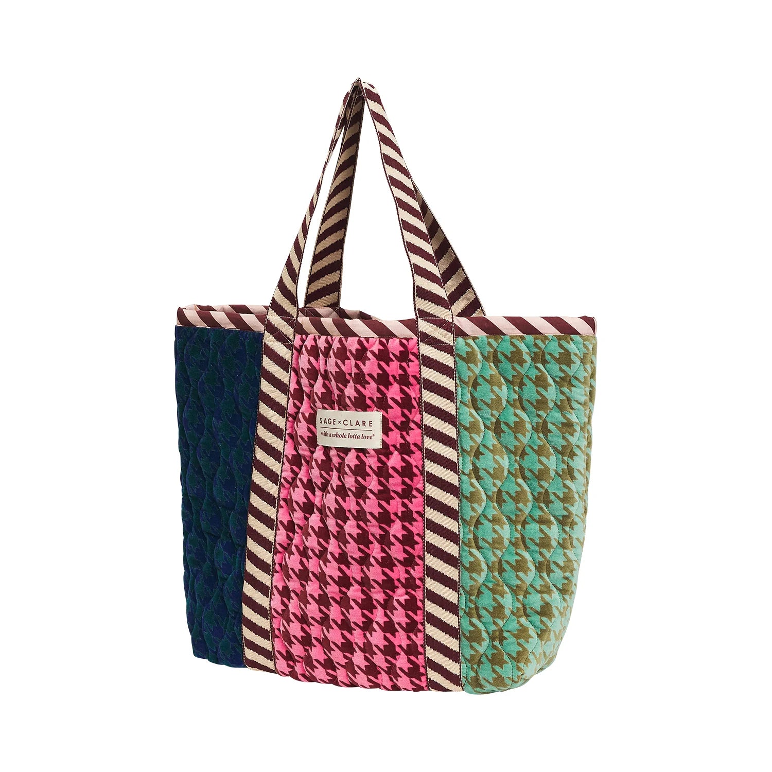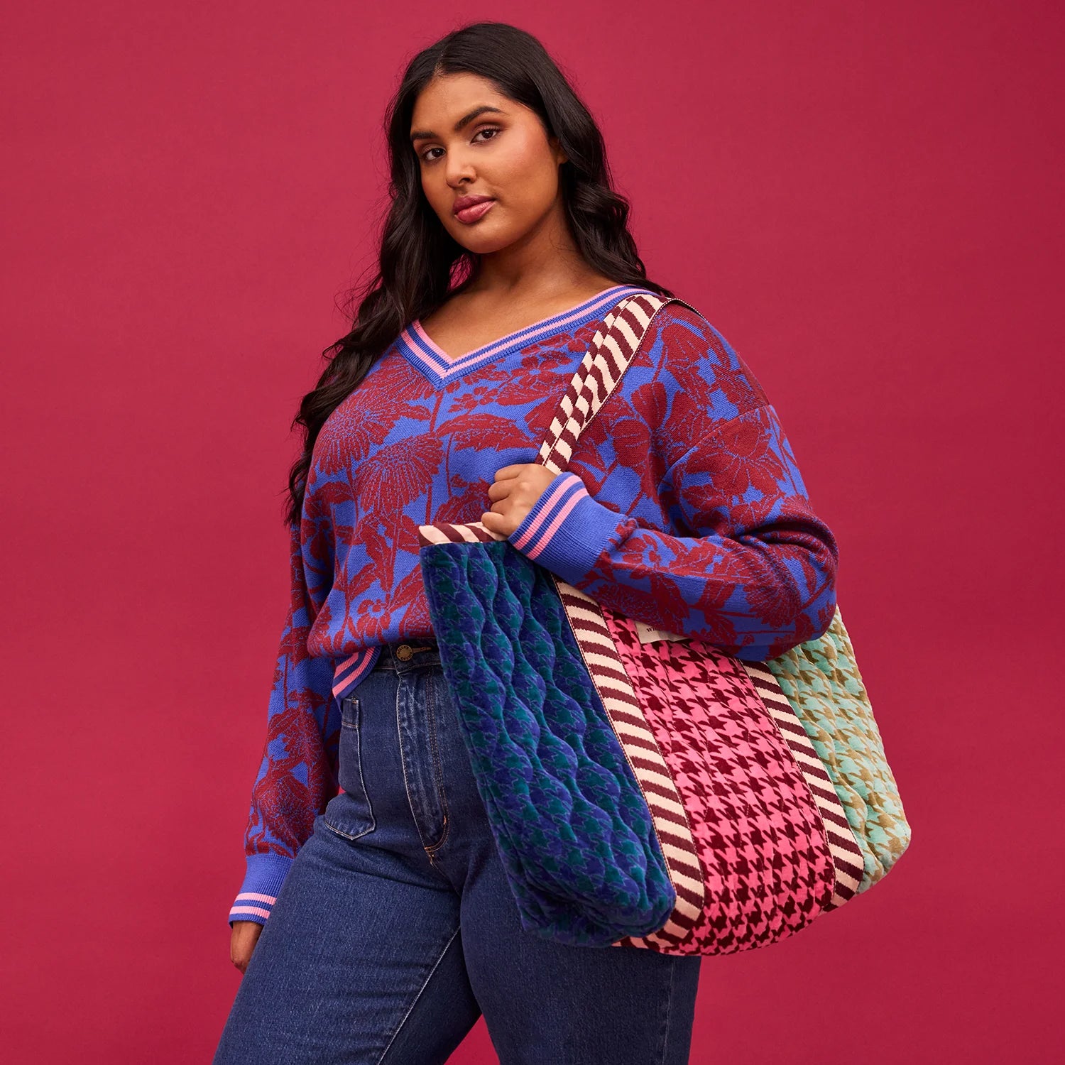 “Step out into the world with the rich and textural print of this spacious tote bag. In eye-catching three-toned houndstooth colourways paired with contrasting striped edging, this is the soft statement tote your wardrobe needs.” – Phoebe’s Style Notes