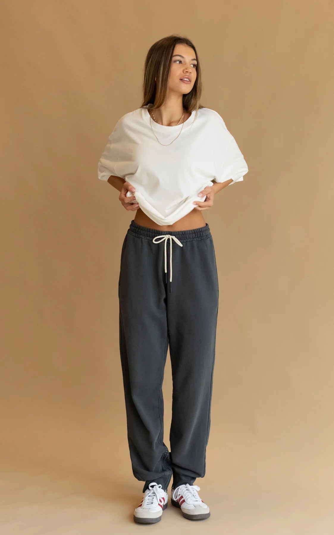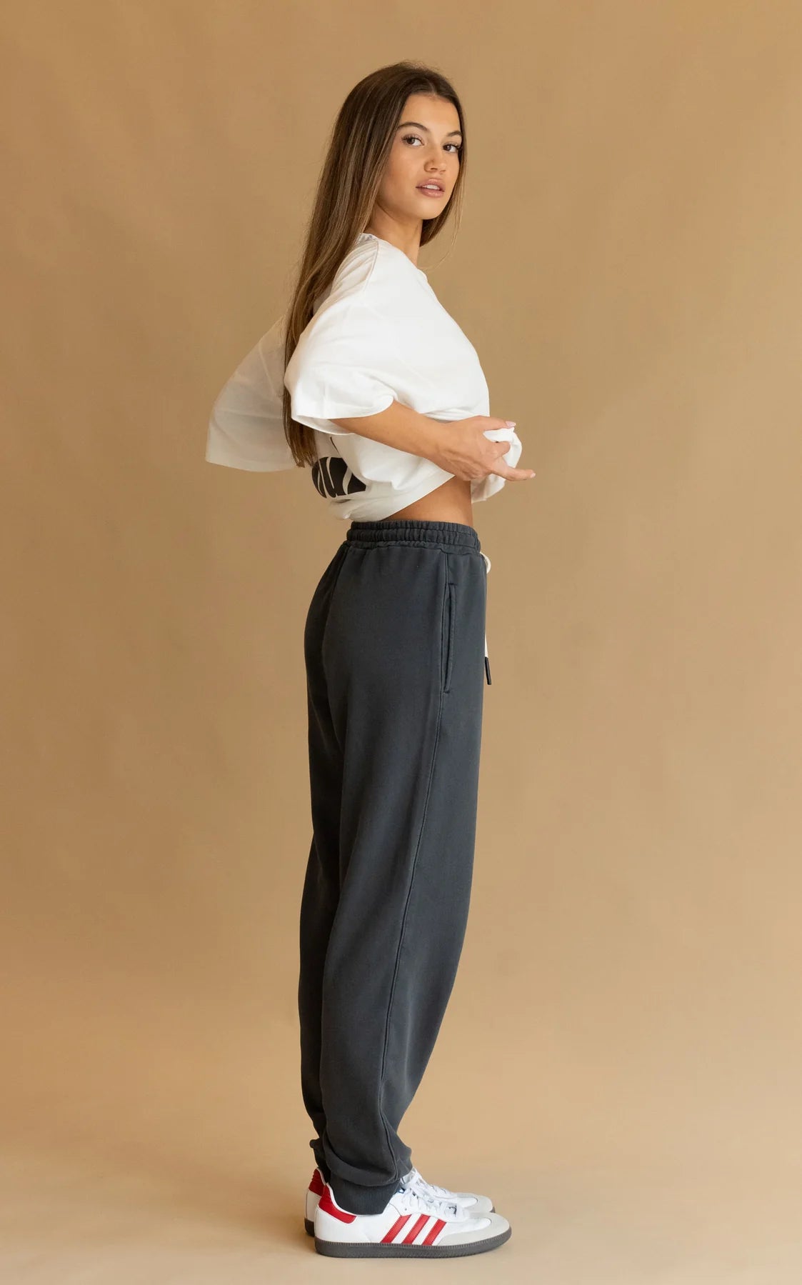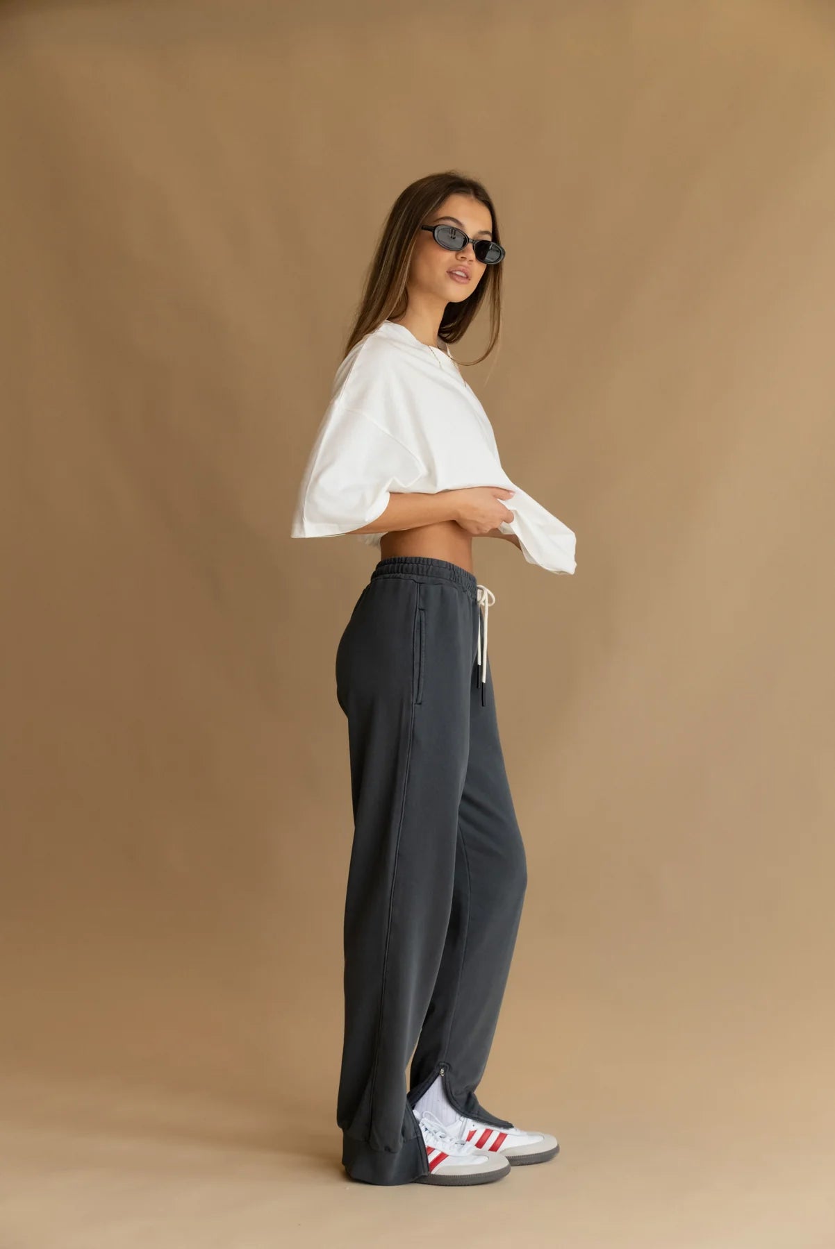 Introducing our Zip Hem Trackpant in chic Washed Black, your new wardrobe essential. Cut in a flattering shape from soft brushed cotton fleece with our silicone-dipped rope drawstring at the waist. Added zippers at the cuffs provide the ultimate practicality and versatility. Garment-dyed to create a vintage and edgy aesthetic. Pair back with our Oui Tee and Sweatshirt for a relaxed yet elevated leisurewear look.